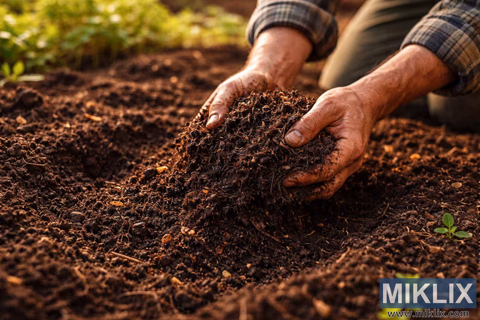 Close-up photo of hands working nutrient-rich compost into garden soil, preparing a fertile planting bed in warm natural afternoon light.