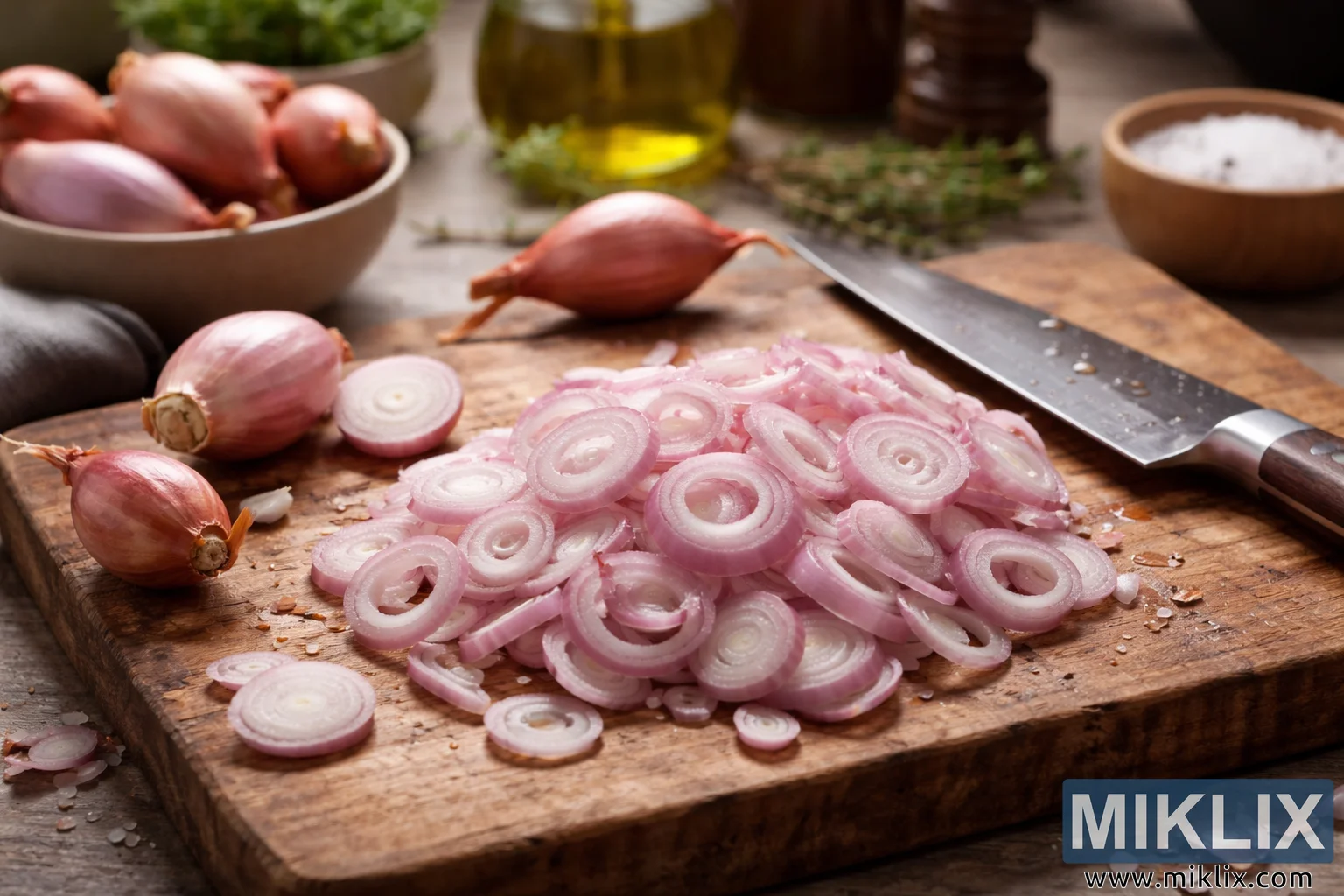 Close-up kitchen scene featuring freshly sliced shallots on a rustic wooden cutting board with a chef’s knife, herbs, olive oil, and coarse salt in the background.