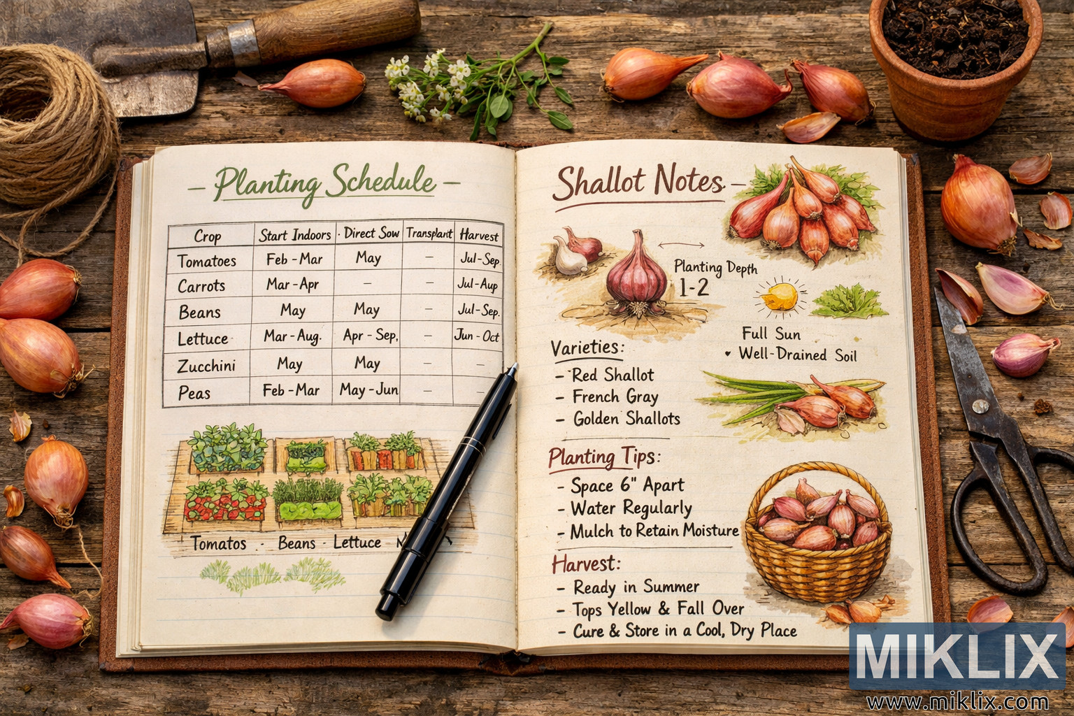 A garden planning notebook lies open on a wooden table displaying a planting schedule and illustrated shallot growing notes, surrounded by gardening tools and fresh shallots.