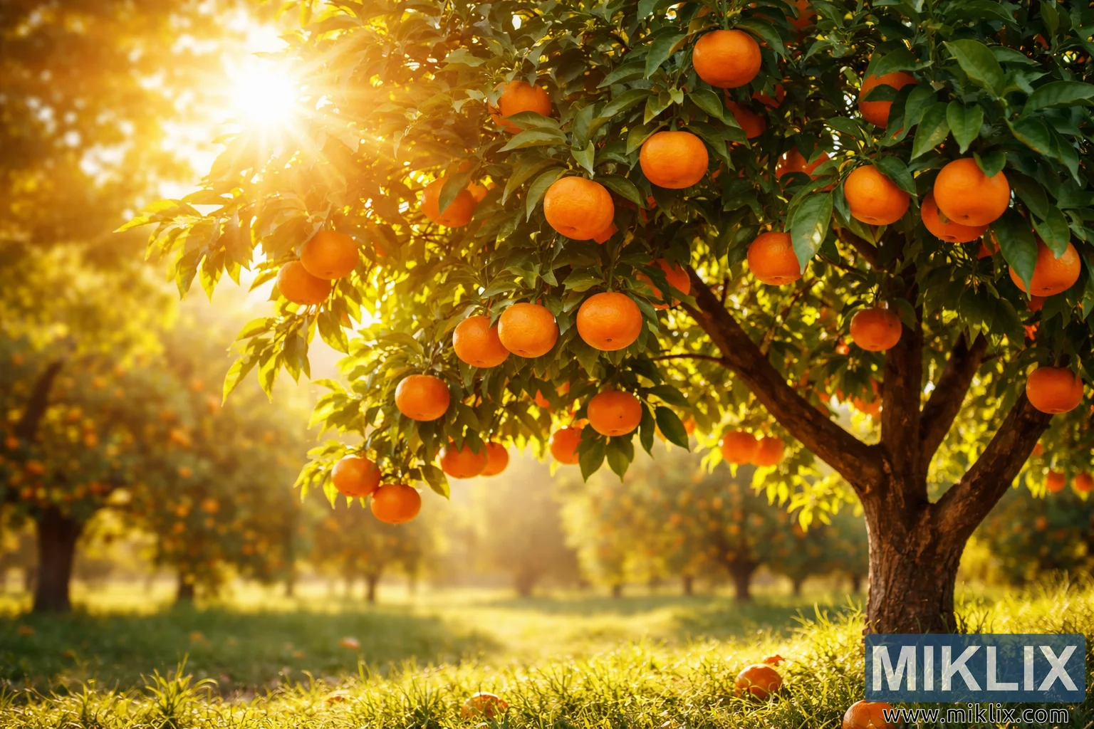 The trunk of the tree rises from a small patch of grassy ground, its bark textured and slightly rugged, showing natural grooves and earthy brown tones. Near the base, a few fallen tangerines rest on the grass, hinting at the abundance of fruit on the tree and adding a sense of realism and seasonal harvest. The grass around the tree is softly illuminated, with blades catching the sunlight and reflecting warm highlights.