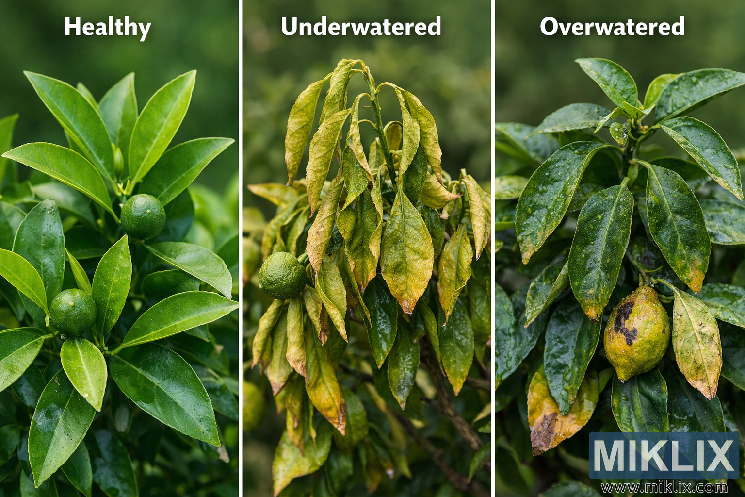 Visual comparison of healthy, underwatered, and overwatered citrus plant foliage, highlighting leaf color, structure, and fruit condition under different watering conditions.