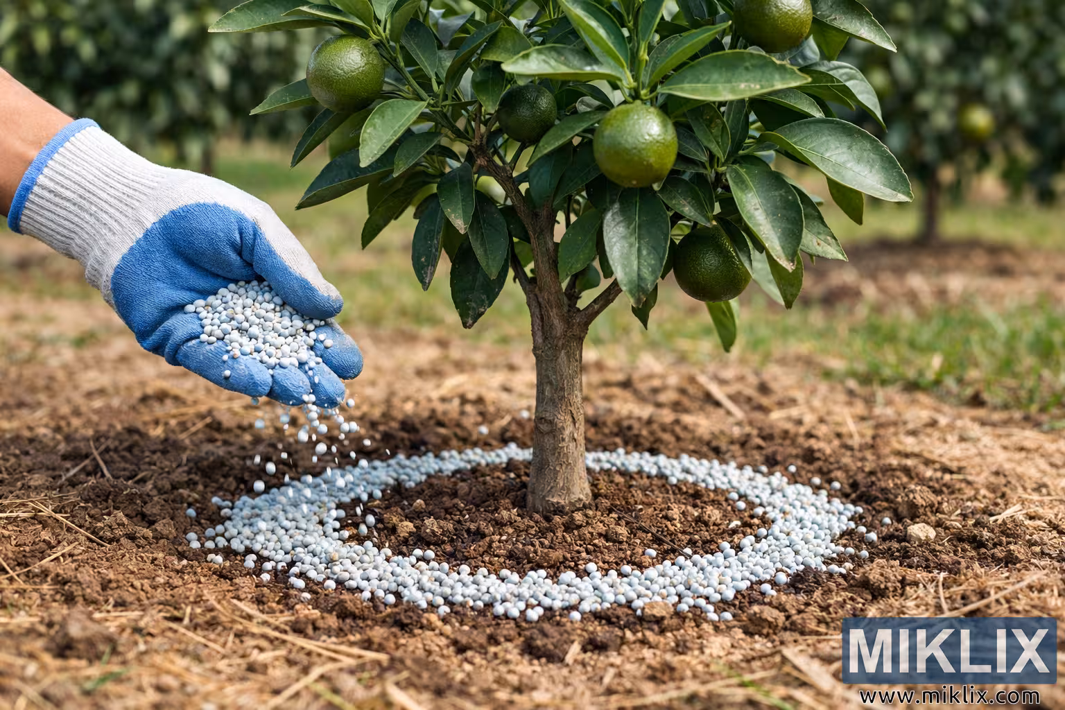 A gardener carefully applies granular fertilizer around the base of a young tangerine tree, demonstrating proper nutrient placement to support healthy citrus growth in an orchard.