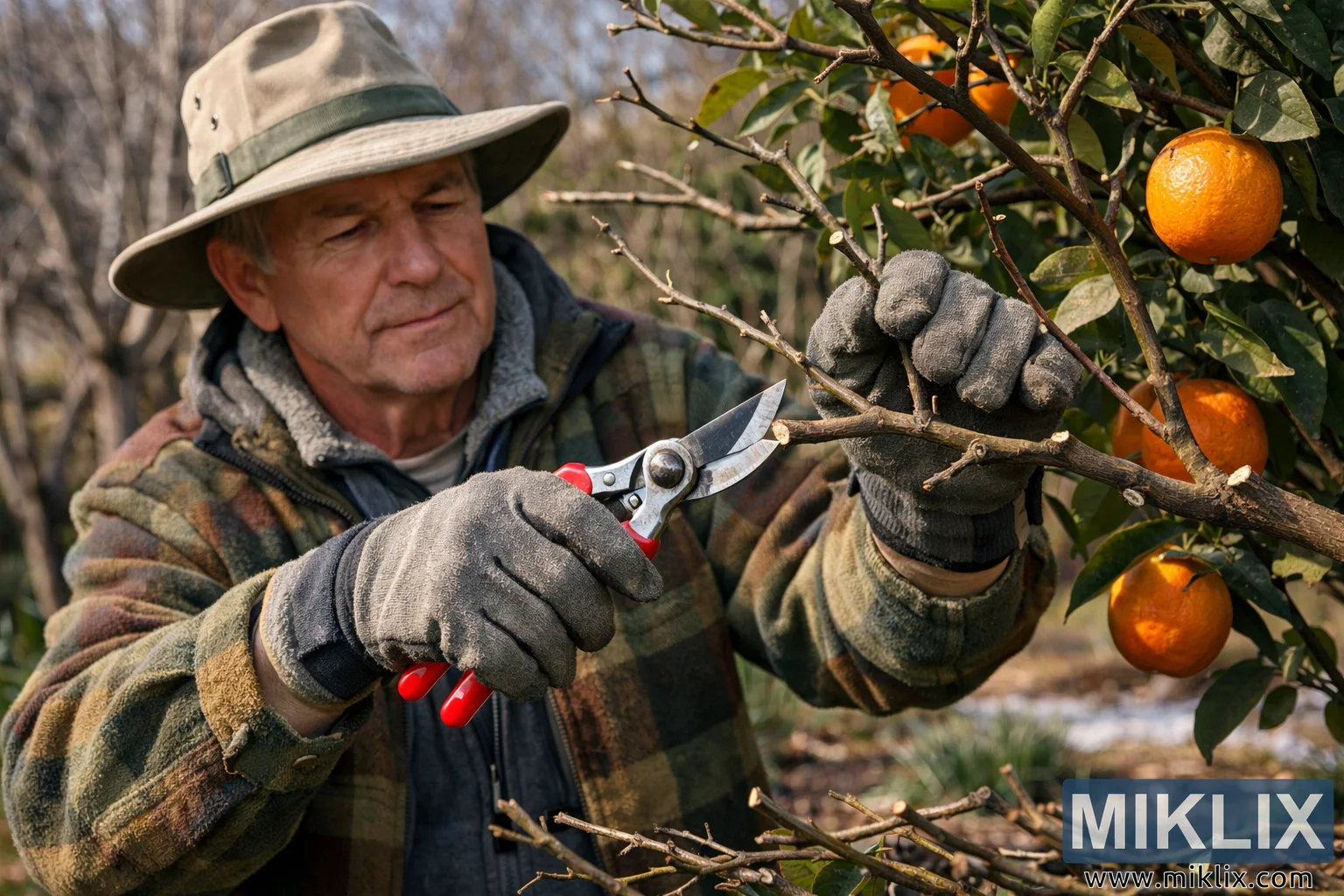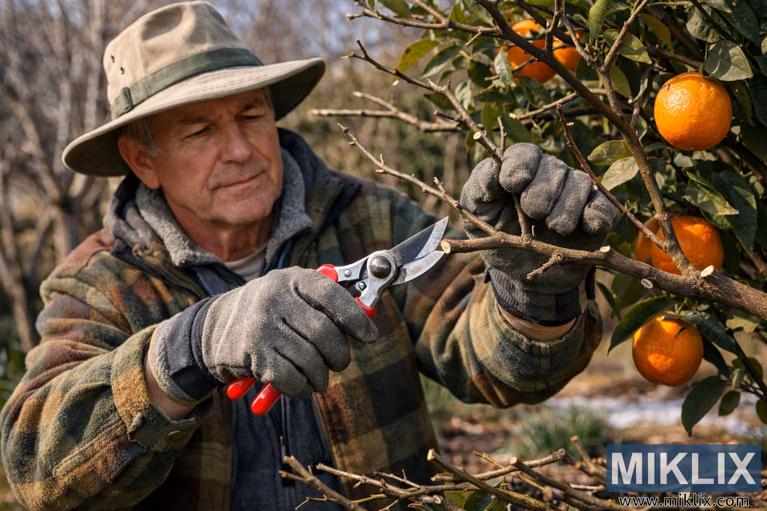 A close-up outdoor scene shows an experienced gardener carefully pruning a citrus tree during late winter, a critical time for shaping citrus trees before the spring growing season begins. The gardener, an older man dressed in practical outdoor clothing, stands beside a healthy orange tree in a backyard orchard or garden setting. He wears a wide-brimmed hat that shields his face from the sunlight, a warm plaid jacket layered over a fleece vest, and sturdy gardening gloves designed to protect his hands while handling branches and pruning tools. His focused expression and steady posture convey concentration and familiarity with the task, suggesting years of gardening experience.