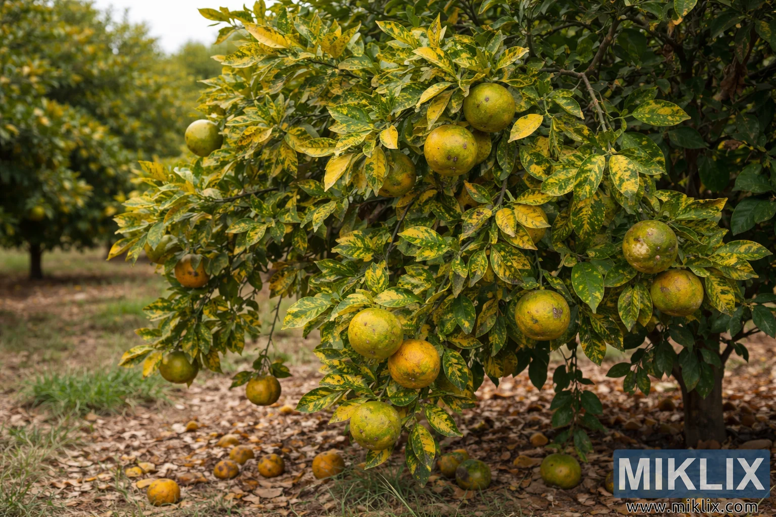 High-resolution photo of a tangerine tree infected with Huanglongbing (citrus greening), showing yellow mottled leaves, damaged fruit, and fallen citrus in an orchard.