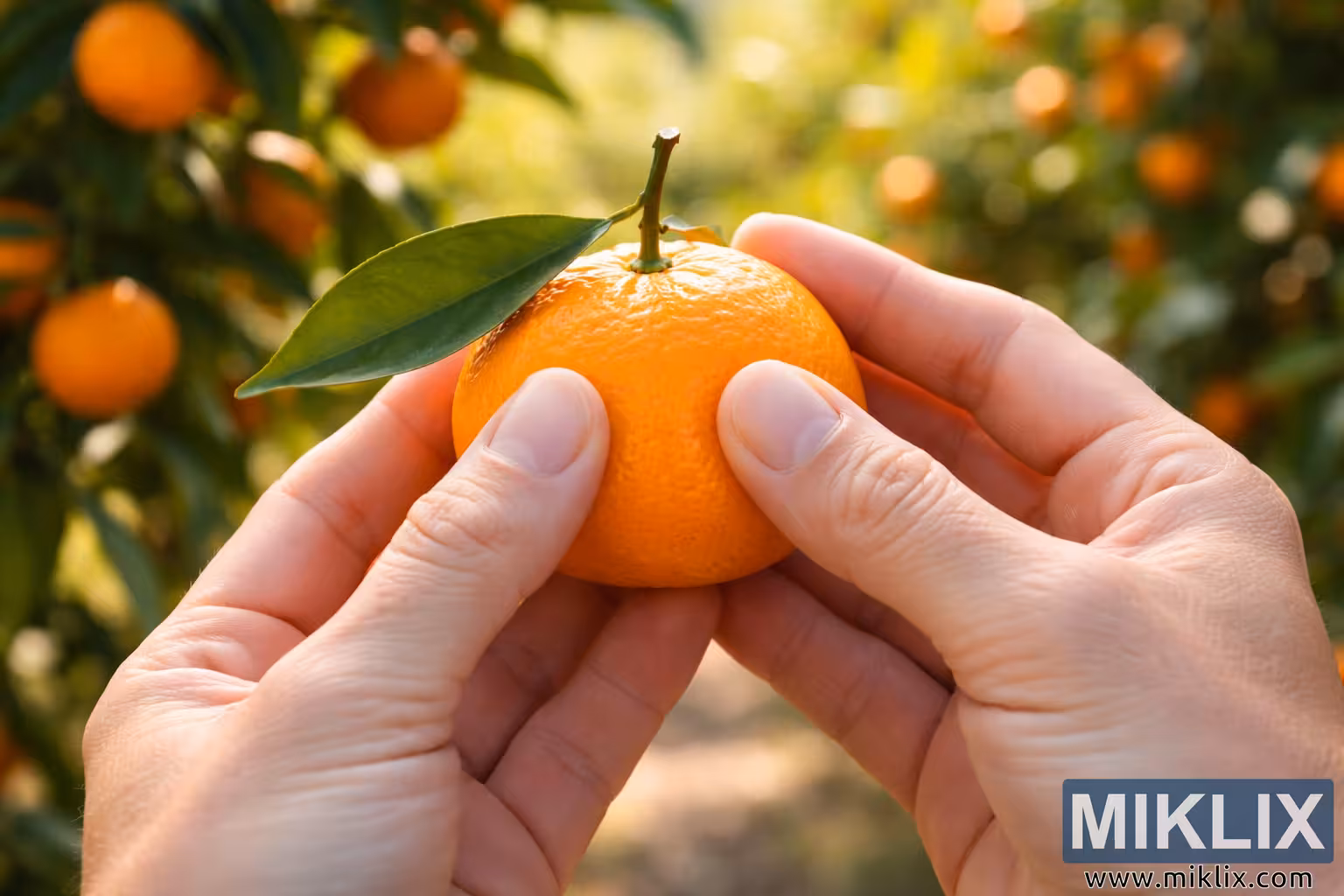 Close-up of hands testing the ripeness of a freshly picked tangerine with gentle thumb pressure in a sunlit citrus orchard.