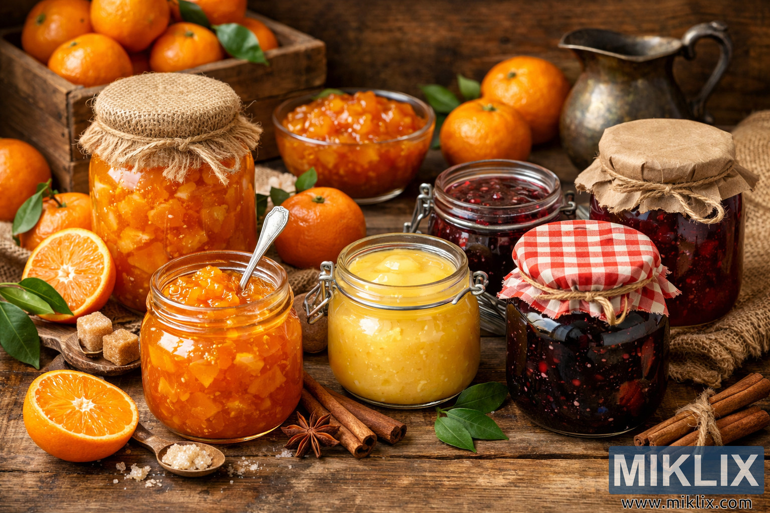 A rustic kitchen scene featuring jars of homemade tangerine marmalade, curds, and fruit preserves beautifully arranged on a wooden table with fresh citrus and spices.