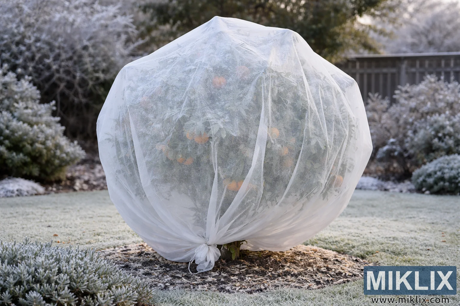 A citrus tree stands in the center of a quiet residential garden during a cold winter morning, carefully wrapped in a translucent white frost protection cloth designed to shield it from freezing temperatures. The protective fabric drapes loosely over the entire canopy of the tree, forming a rounded, tent-like shape that extends from the top of the foliage down to the ground. The cloth gathers near the base of the trunk where it is tied together, preventing cold air from entering and helping to trap warmth around the tree. Through the thin material, the outline of the branches and leaves can be seen, along with several round citrus fruits whose warm orange color subtly shows through the pale covering. The contrast between the faint glow of the fruit and the cool, muted tones of the winter scene adds visual interest and hints at the living plant protected beneath the fabric.
