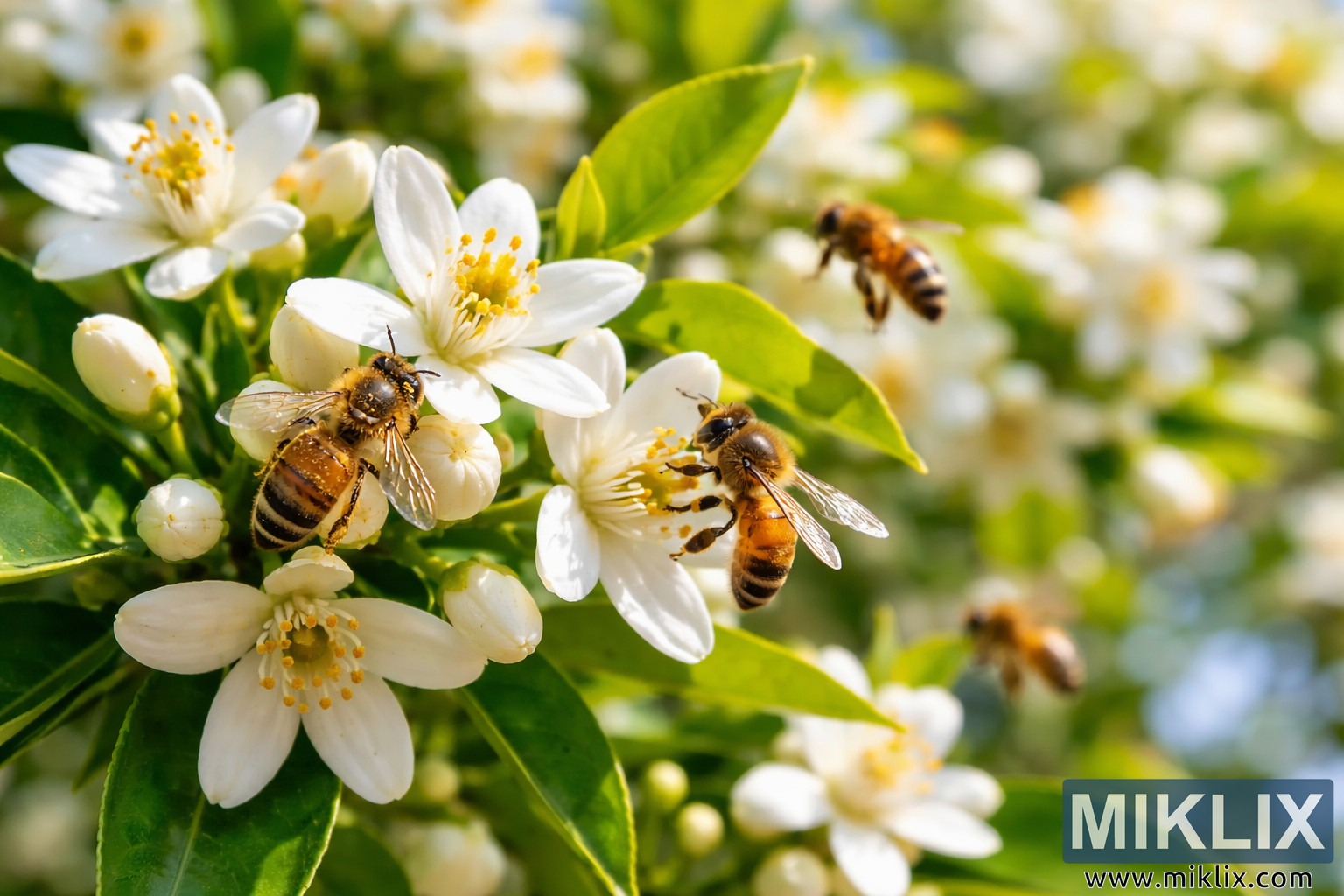 Image: Bees Pollinating Citrus Blossoms in Sunlit Orchard