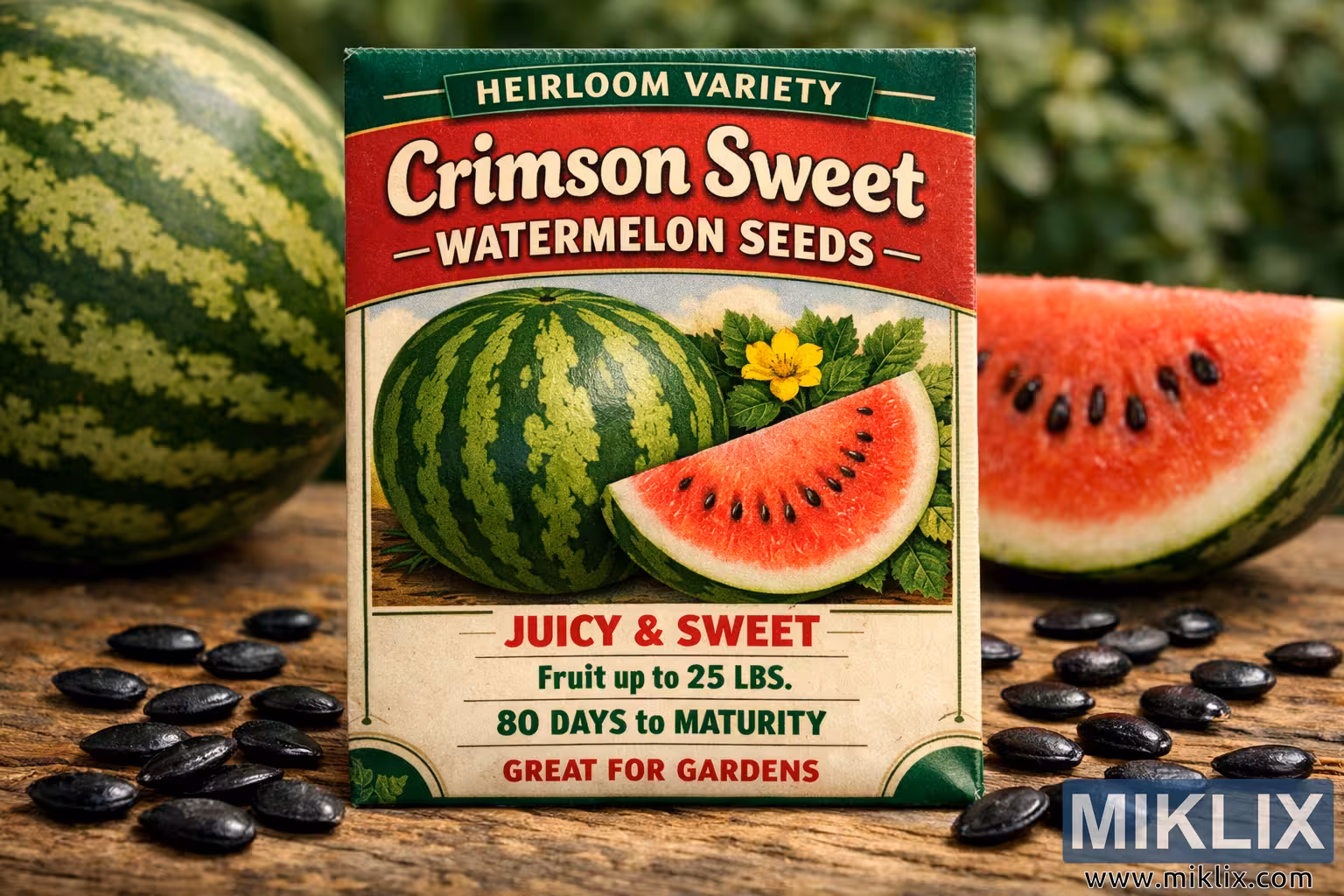 High-resolution photo of a Crimson Sweet watermelon seed packet displaying variety information, placed on a wooden table with loose seeds and fresh watermelon slices.