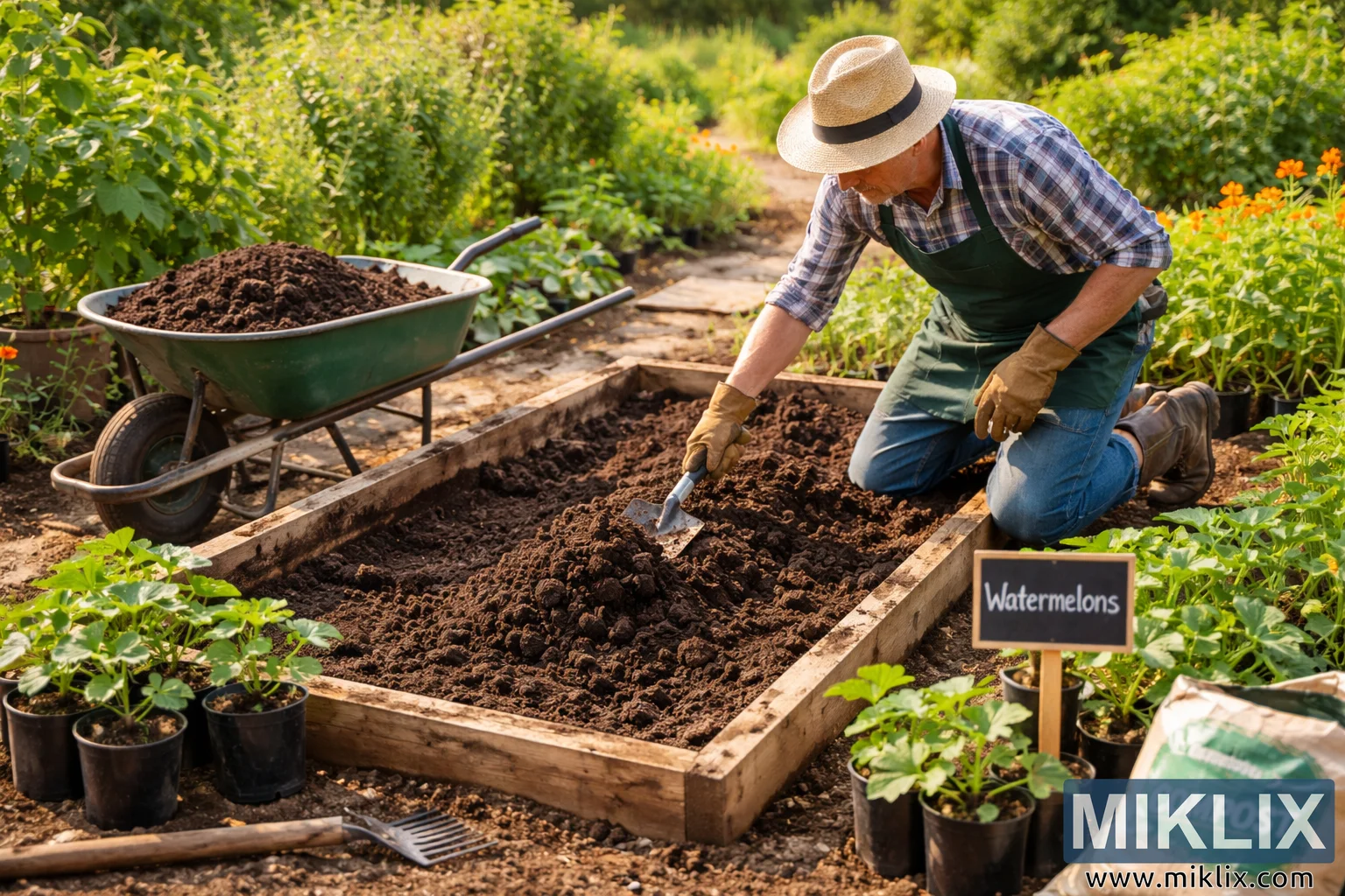 A gardener prepares a raised soil bed by mixing rich compost for watermelon planting, surrounded by seedlings, tools, and lush garden plants in warm afternoon light.