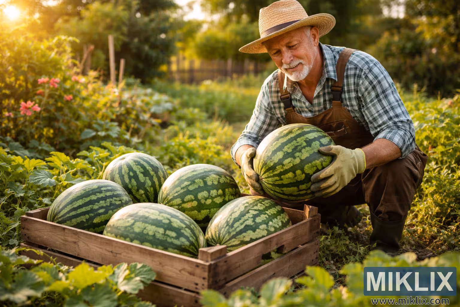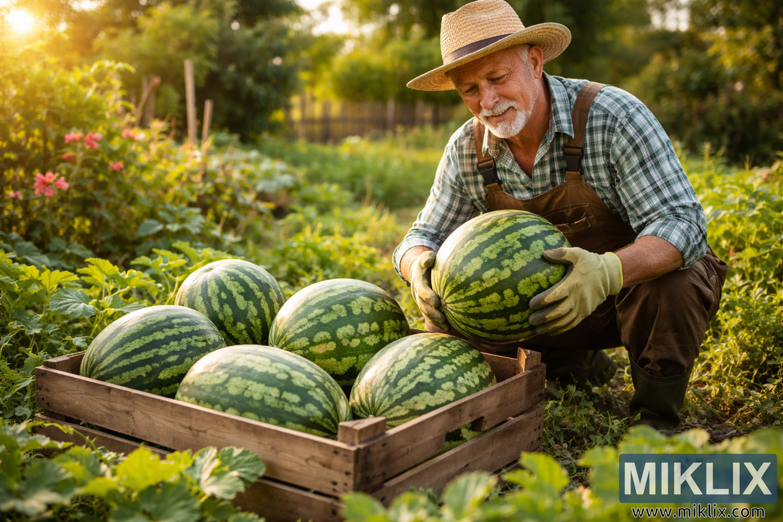 At the center of the image, a middle-aged gardener kneels beside a wooden crate filled with freshly picked watermelons. He wears a wide straw hat that shades his face from the sun, along with a green plaid shirt and sturdy brown overalls that suggest practical, everyday gardening work. A pair of light gardening gloves protects his hands as he carefully lifts a large watermelon. His expression appears relaxed and content, reflecting pride in the successful harvest.