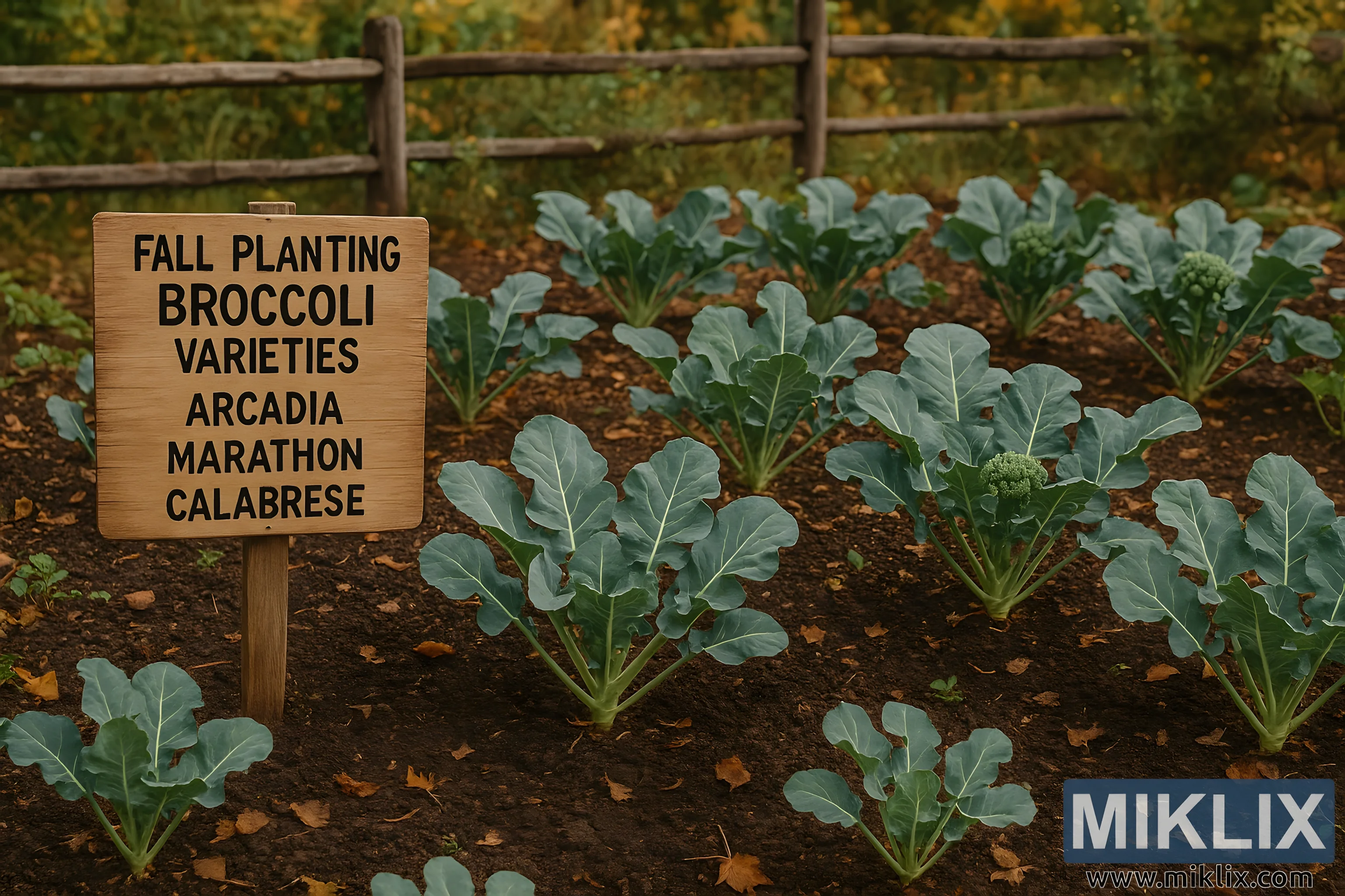 The image overall communicates themes of sustainability, traditional agriculture, and the beauty of fall gardening. Each visual element—from the handcrafted sign to the textured soil and rustic fencing—adds to an atmosphere of warmth, simplicity, and care. The broccoli varieties named (Arcadia, Marathon, and Calabrese) further root the image in authenticity, referencing real cultivars favored by gardeners for their resilience and flavor. This photographic composition invites viewers to appreciate both the practical and aesthetic aspects of growing food seasonally, celebrating the quiet productivity of a rustic vegetable garden in autumn.