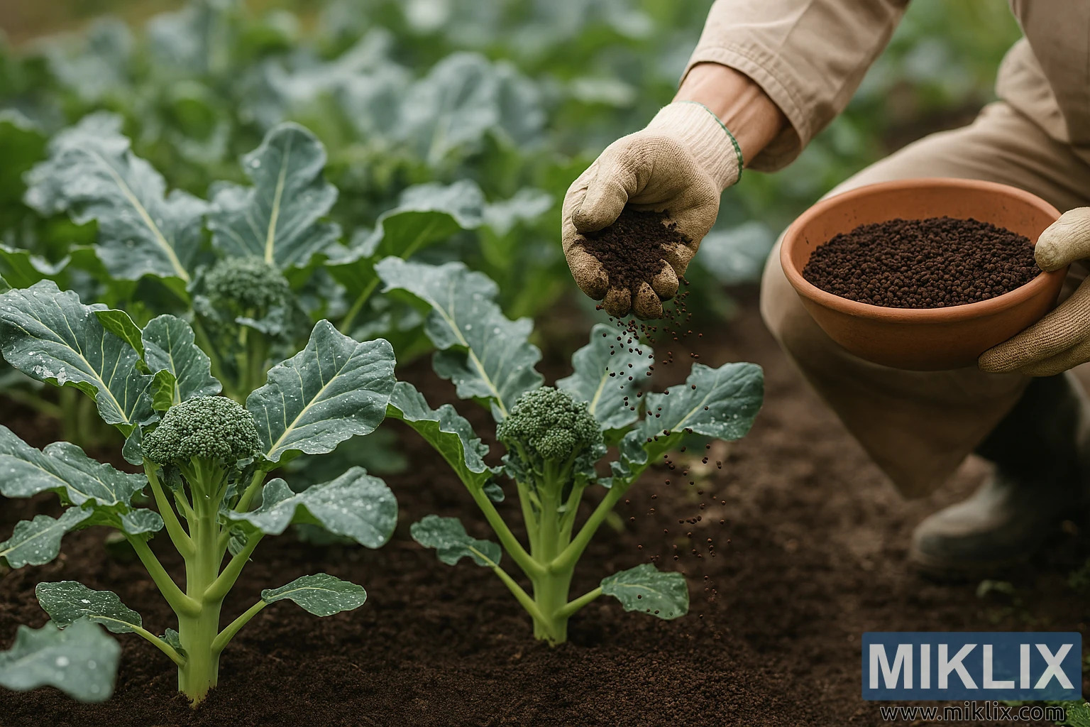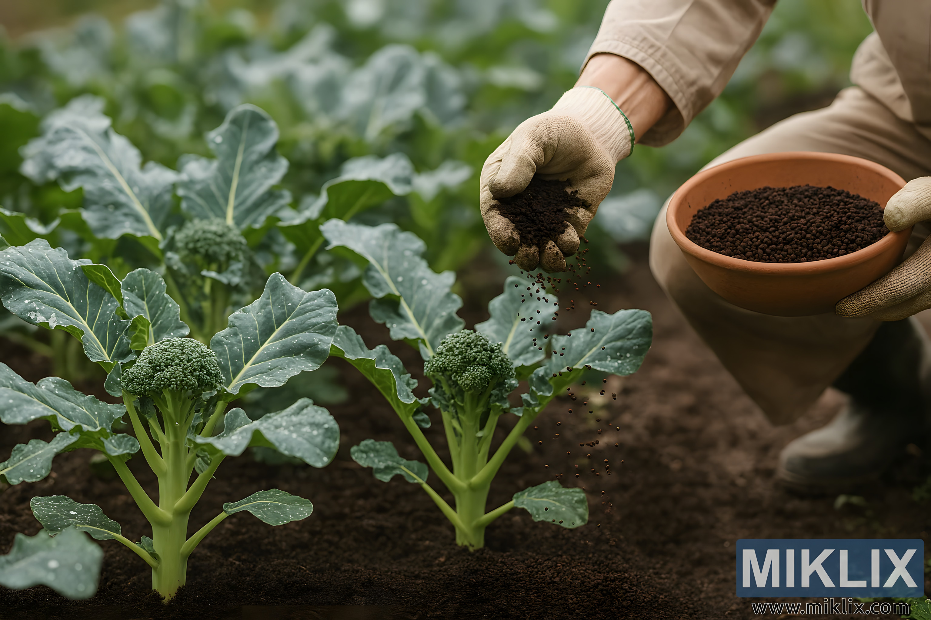A close-up view of a gardener applying organic fertilizer to healthy broccoli plants, highlighting sustainable farming practices and natural growth.