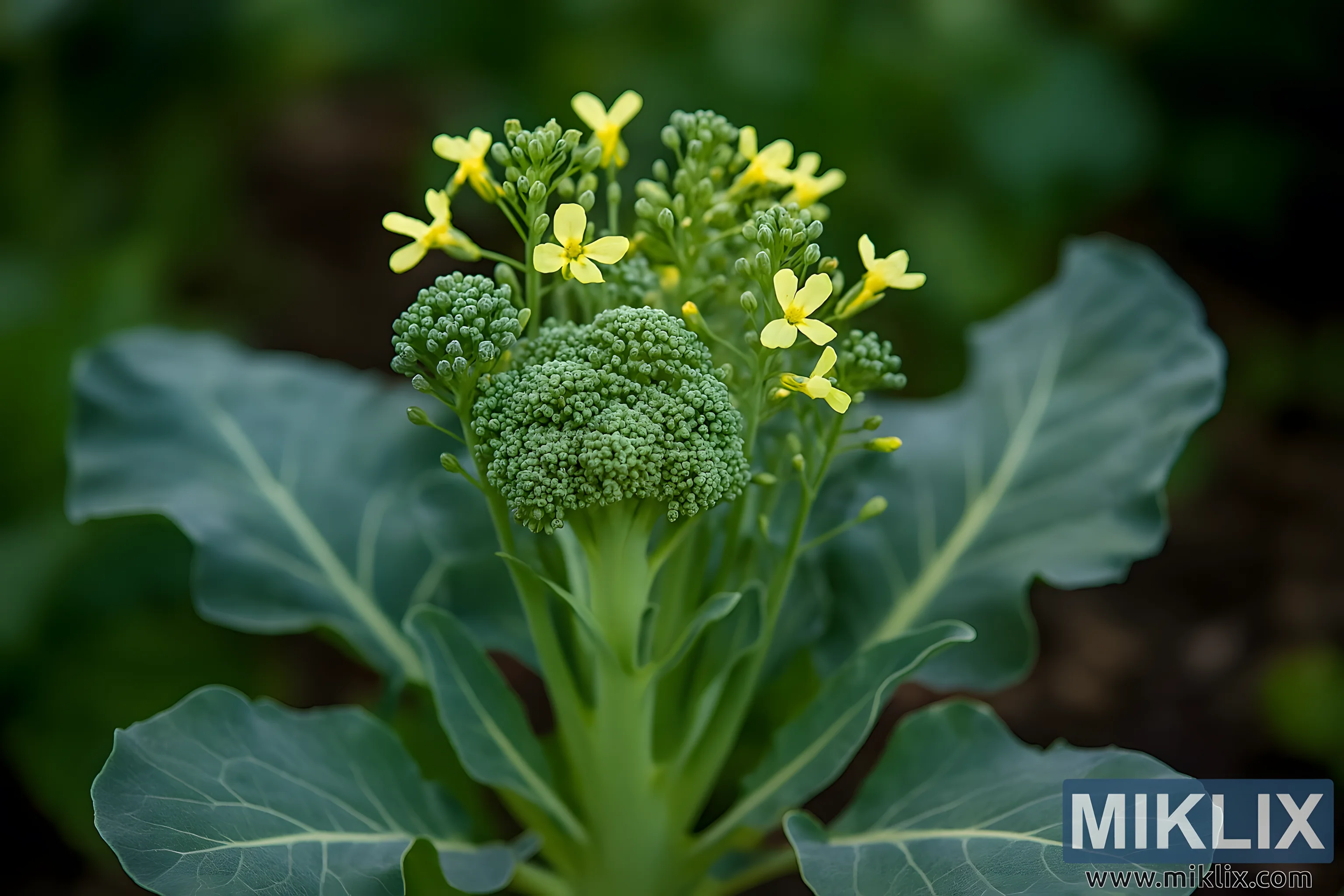 The background itself is intentionally subdued, rendered in varying shades of green that suggest a lush garden environment without distracting from the main subject. The shallow depth of field isolates the broccoli plant, ensuring that the viewer’s attention remains fixed on the interplay between the green buds and the emerging yellow flowers. This compositional choice emphasizes the plant’s transitional state, highlighting both its agricultural significance and its natural beauty.