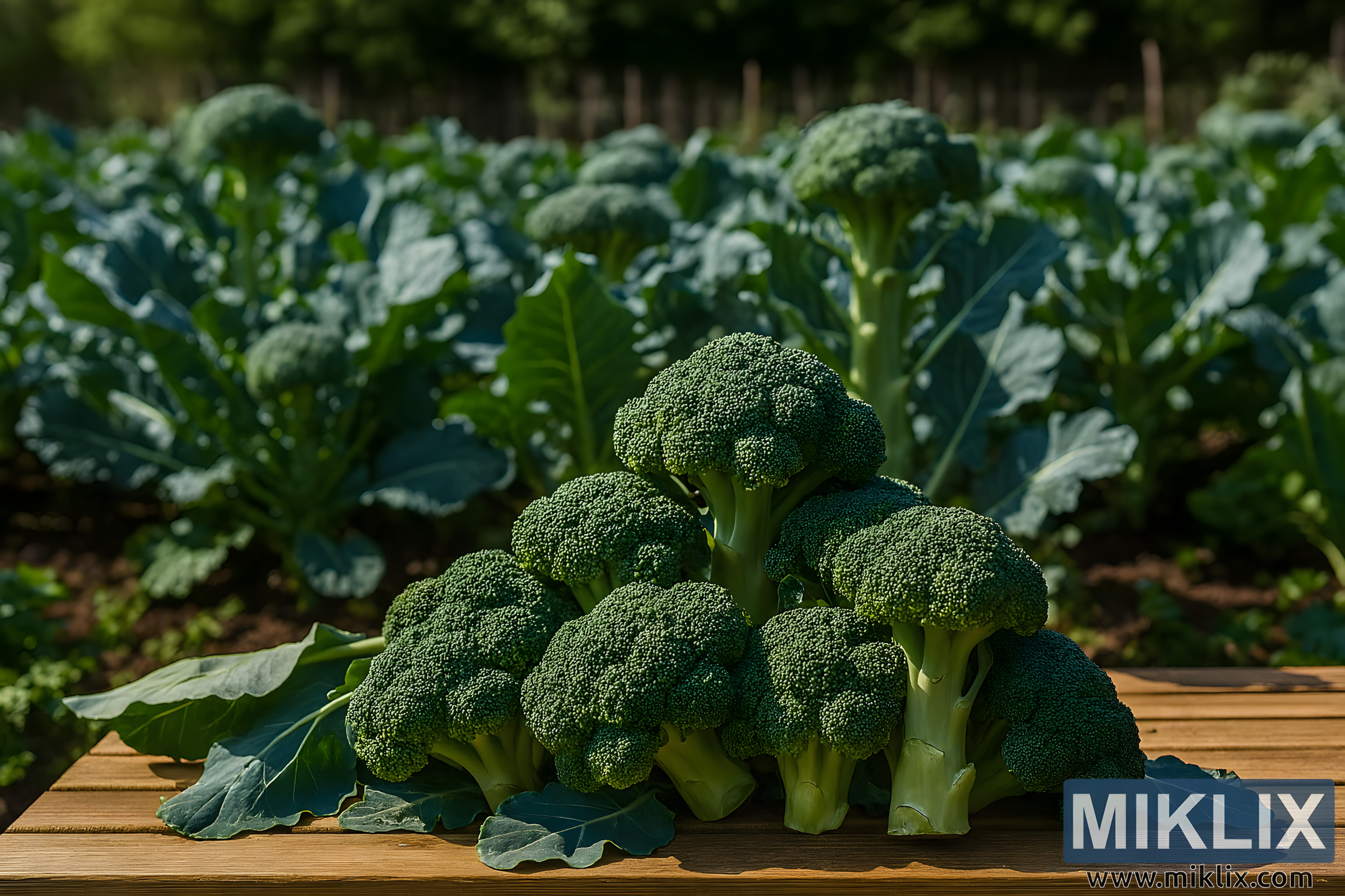 A high-resolution landscape image of a flourishing home garden featuring freshly harvested broccoli heads and thriving plants, symbolizing abundance and healthy living.