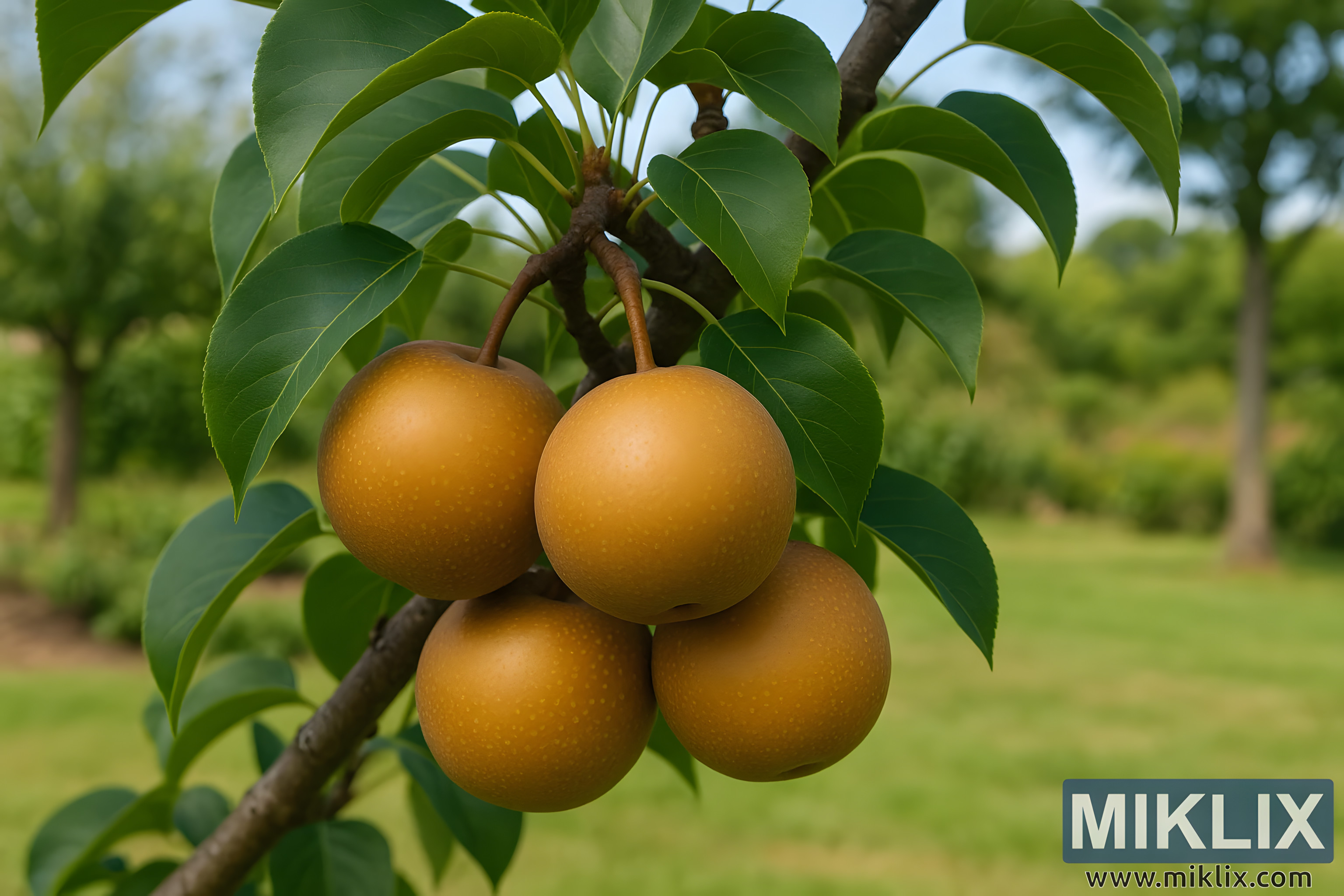 In the background, the shallow depth of field transforms the surrounding garden into a soft blur of green tones. A neatly mowed lawn stretches outward, while hints of distant trees and open sky suggest a calm orchard or home garden setting. The blurred elements provide context without distraction, enhancing the pears’ prominence and creating a tranquil, pastoral atmosphere. The light filtering through the scene is natural and balanced, with no harsh shadows—just enough brightness to highlight the smooth skin of the fruit and the vitality of the leaves.