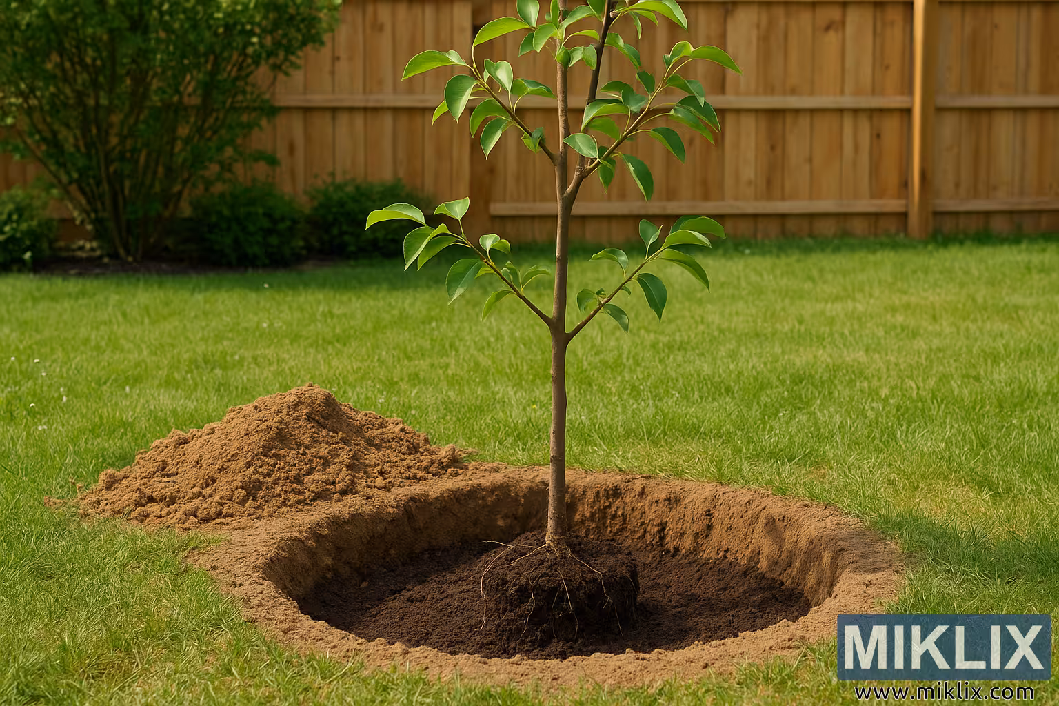 A young pear tree sapling in a freshly dug hole, surrounded by rich soil and a sunny garden, symbolizing growth, care, and future harvests.