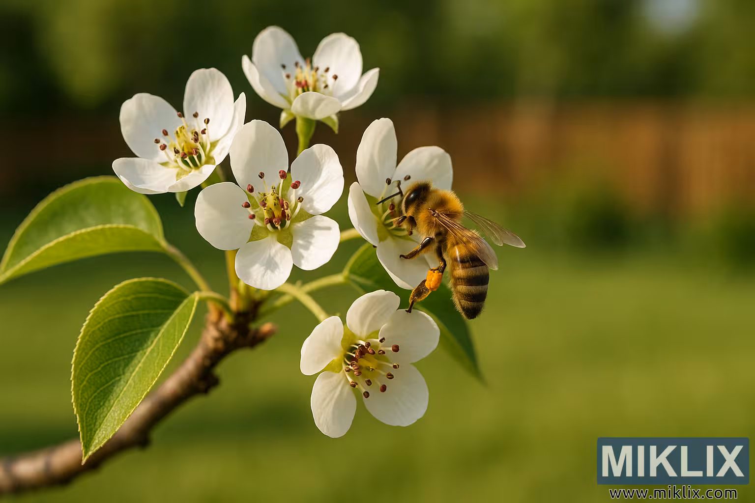 In the background, the image dissolves into a soft blur of greenery, with the faint suggestion of a wooden fence and garden foliage beyond. This bokeh effect provides context—an orchard or backyard setting—without detracting from the sharply focused bee and blossoms in the foreground. The diffuse lighting is warm and even, bathing the scene in golden hues that suggest late afternoon, a prime time for pollinator activity.