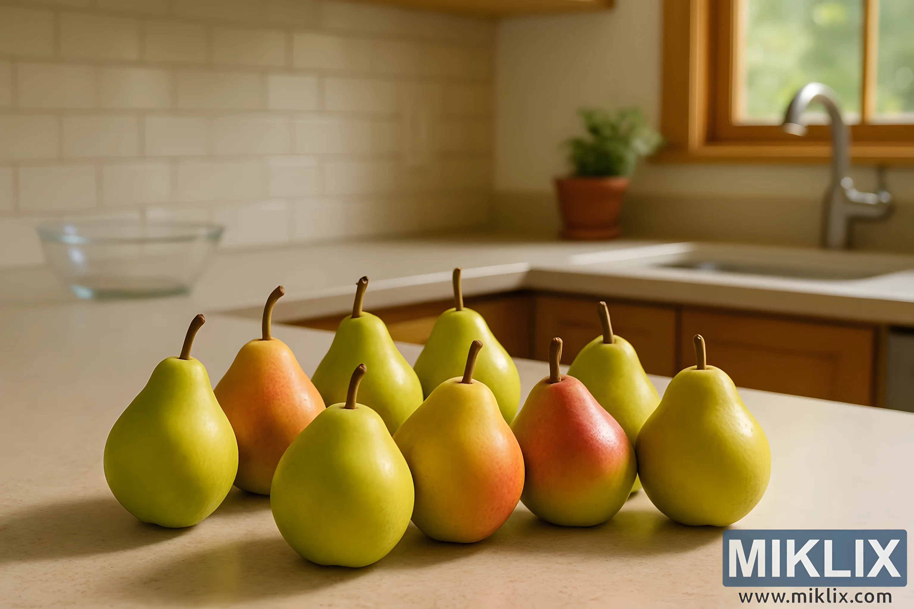 A cluster of freshly harvested pears rests on a beige kitchen counter, their colors glowing in natural daylight, symbolizing seasonal abundance.