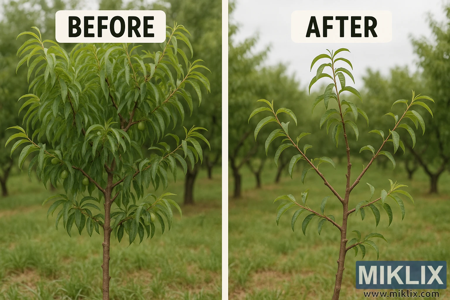 A visual comparison of a peach tree before and after pruning, demonstrating correct horticultural technique for shaping and improving growth in a healthy orchard setting.