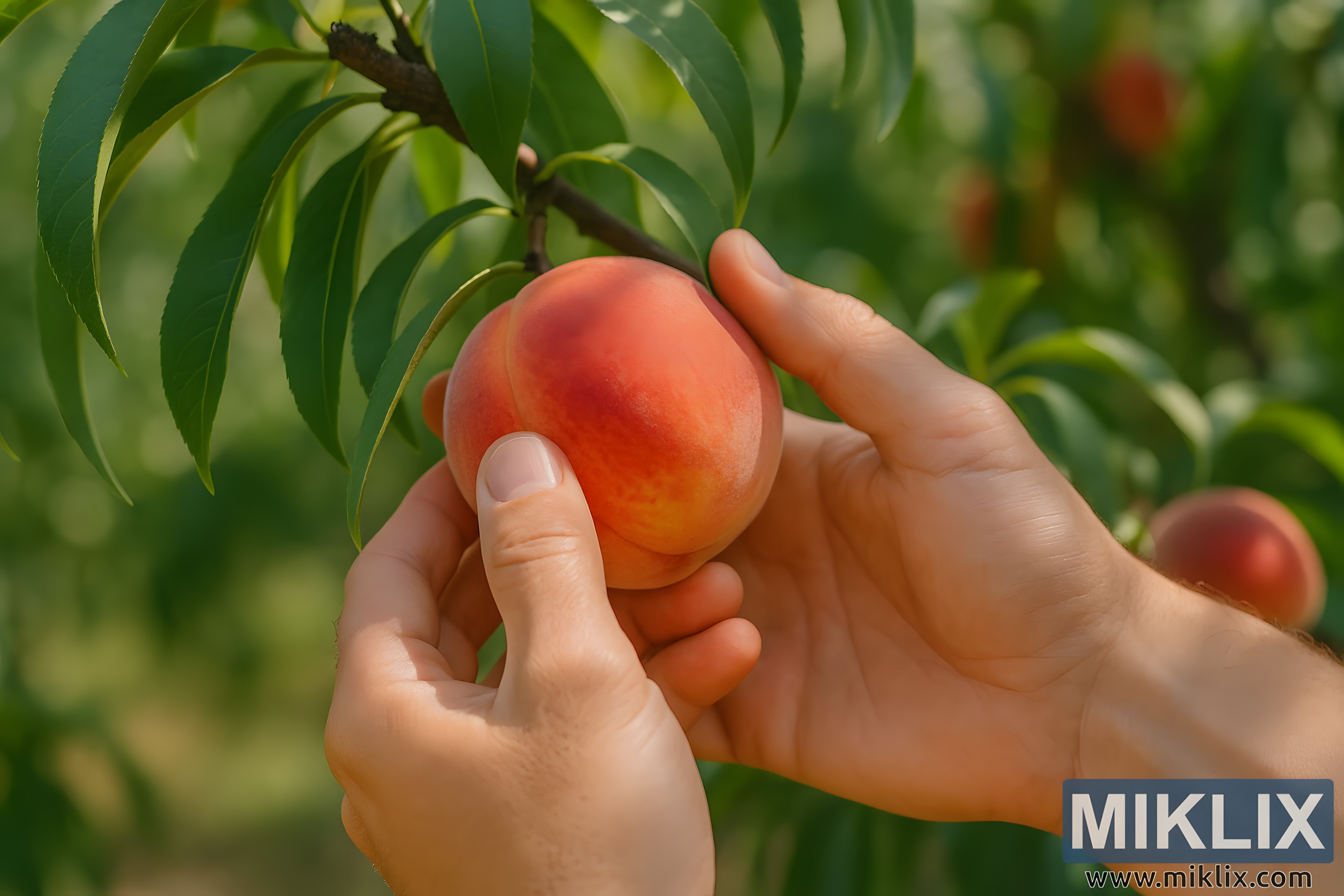 Image: Hand Picking a Ripe Peach from a Tree Using Proper Harvesting Technique