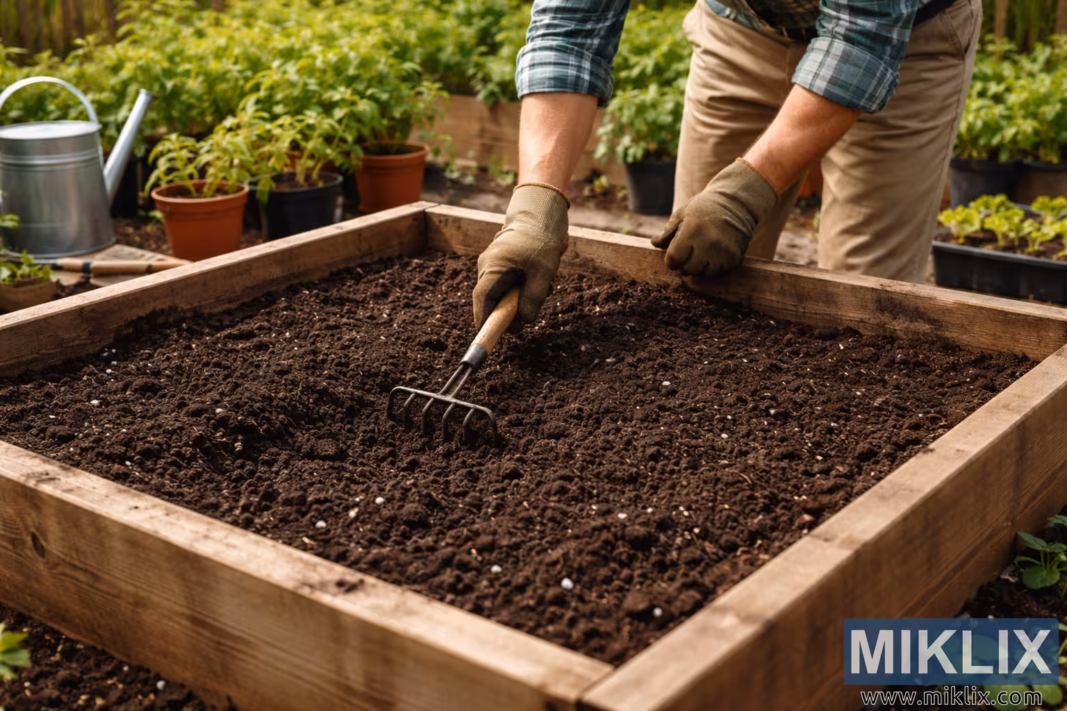 A gardener prepares rich, loose soil in a wooden raised bed using a hand rake, surrounded by potted plants and garden tools in a sunlit garden.