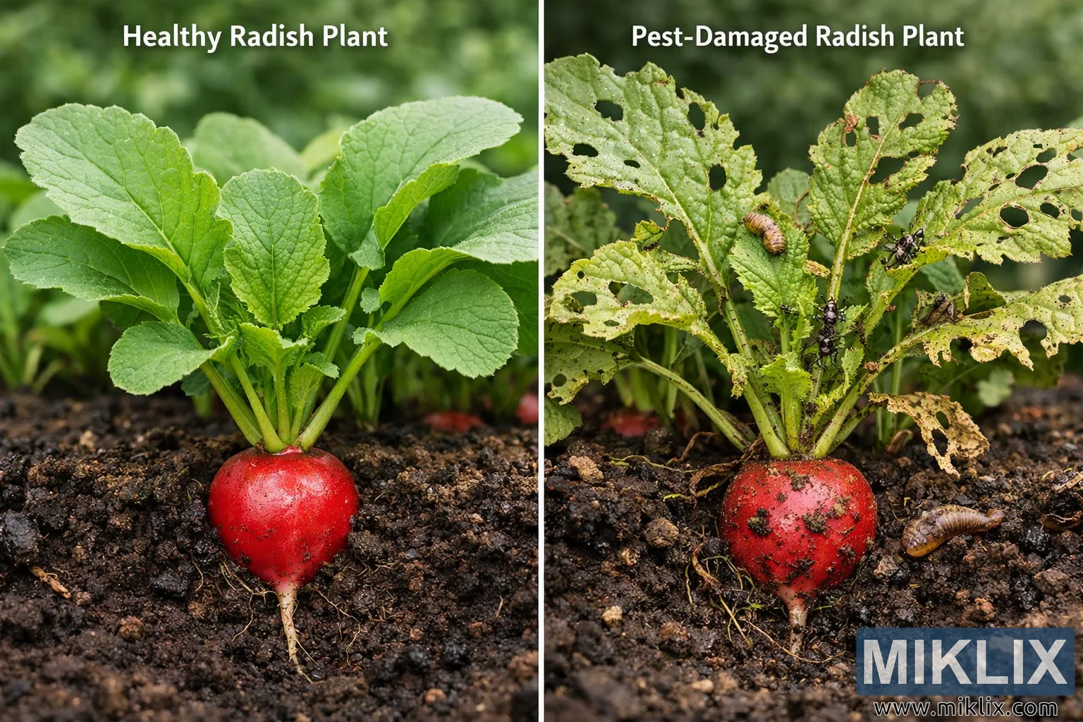 Visual comparison of a healthy radish plant and a pest-damaged radish plant, highlighting leaf damage, insects, and reduced plant health caused by garden pests.