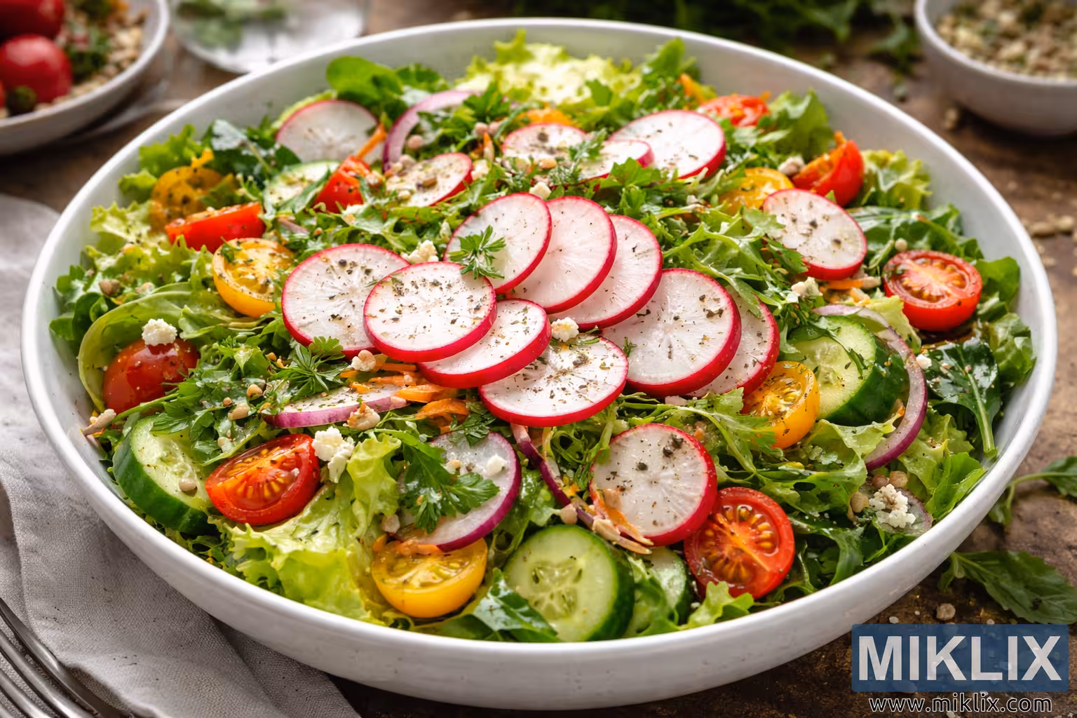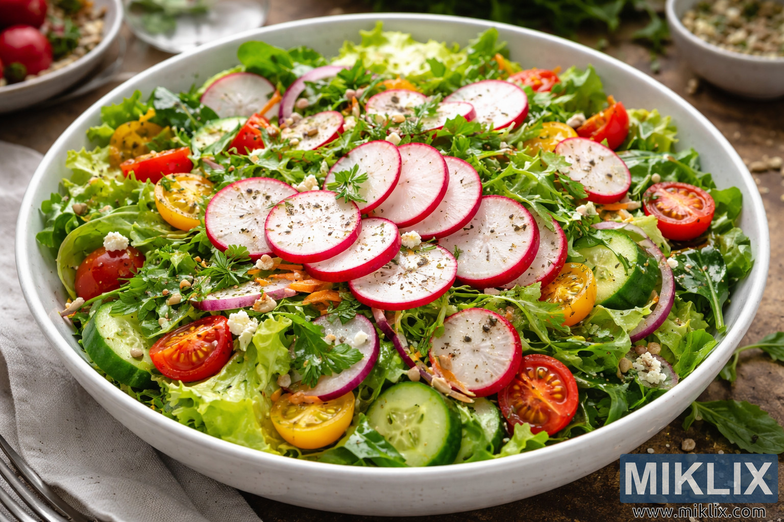 Vibrant garden salad topped with thinly sliced radishes, fresh greens, tomatoes, cucumber, herbs, feta cheese, and seeds in a rustic white bowl.