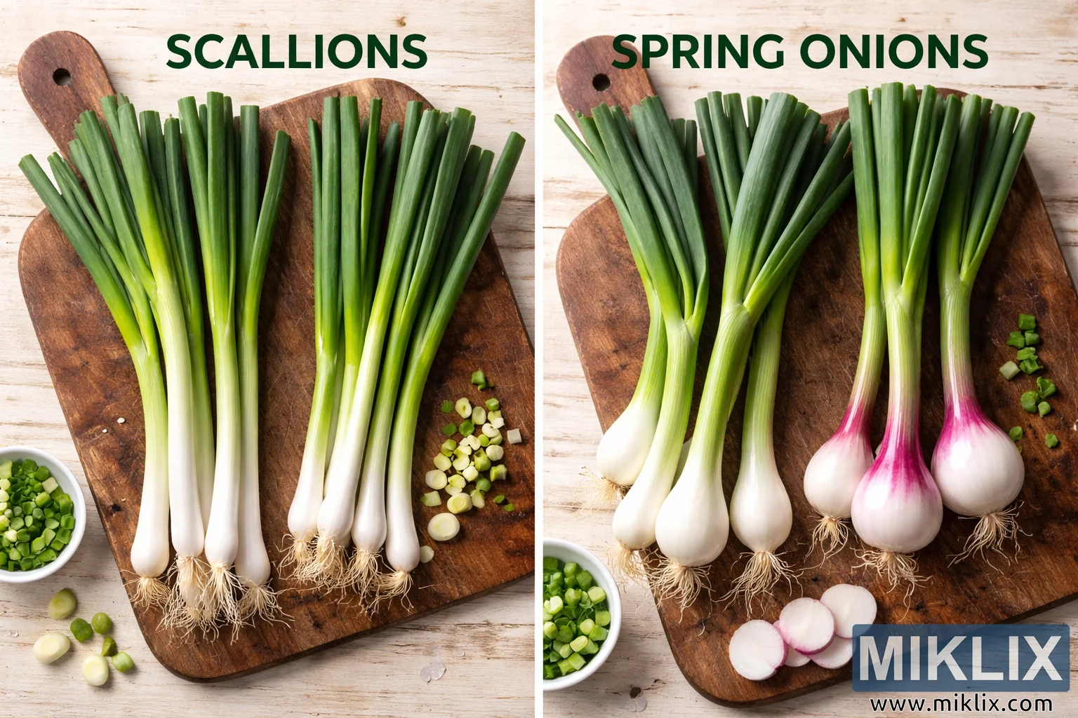 Visual comparison showing scallions and spring onions arranged side by side, illustrating the difference in bulb size, root structure, and overall appearance.