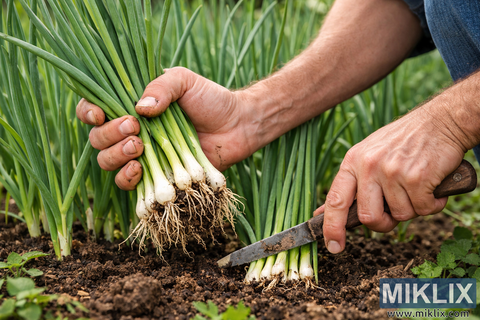 Close-up photograph of hands harvesting fresh scallions from rich garden soil, holding a bunch with roots exposed while cutting another cluster with a knife.