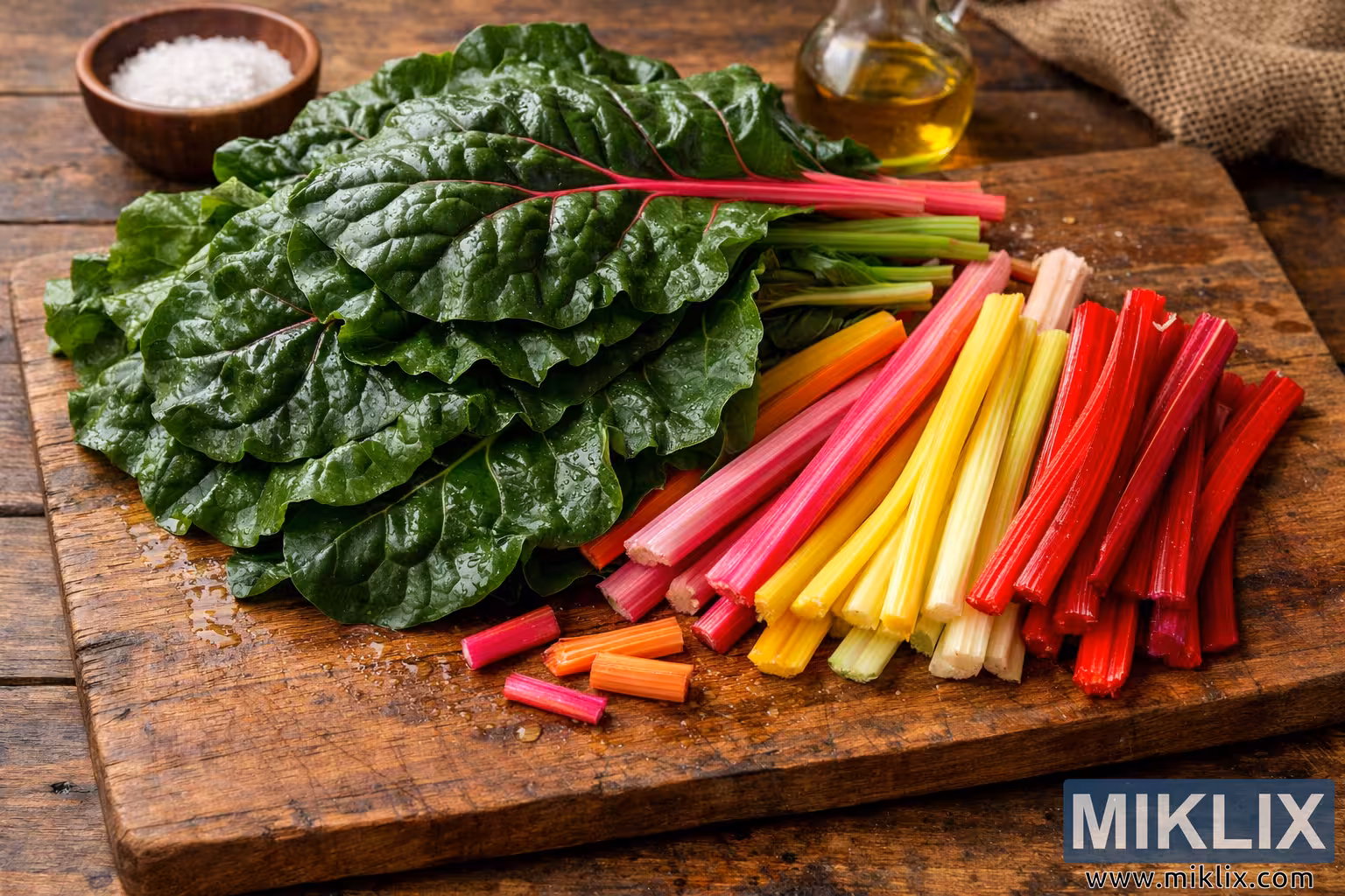 High-resolution image of freshly harvested Swiss chard with vibrant green leaves and multicolored stems arranged on a rustic wooden cutting board.