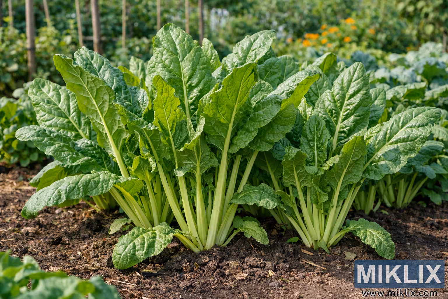 Lush perennial spinach chard plants growing in a productive vegetable garden bed, showing healthy green leaves and sturdy stems in natural daylight.