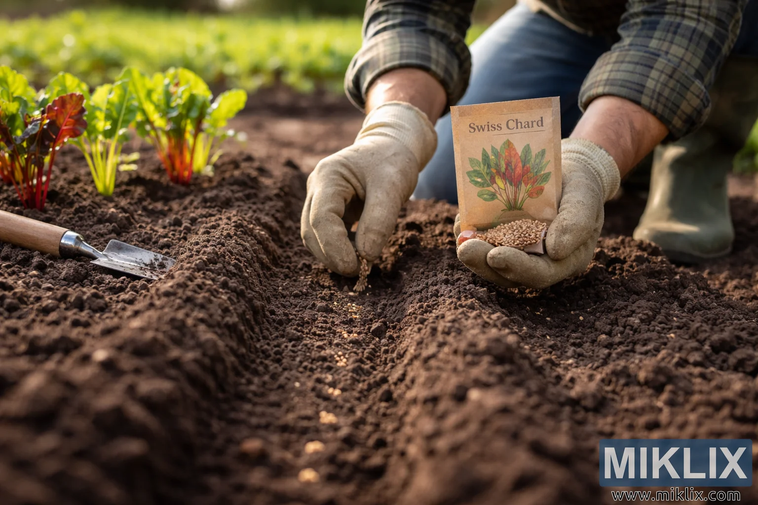 Close-up of a gardener sowing Swiss chard seeds in neat rows in a freshly prepared garden bed on a sunny spring day.