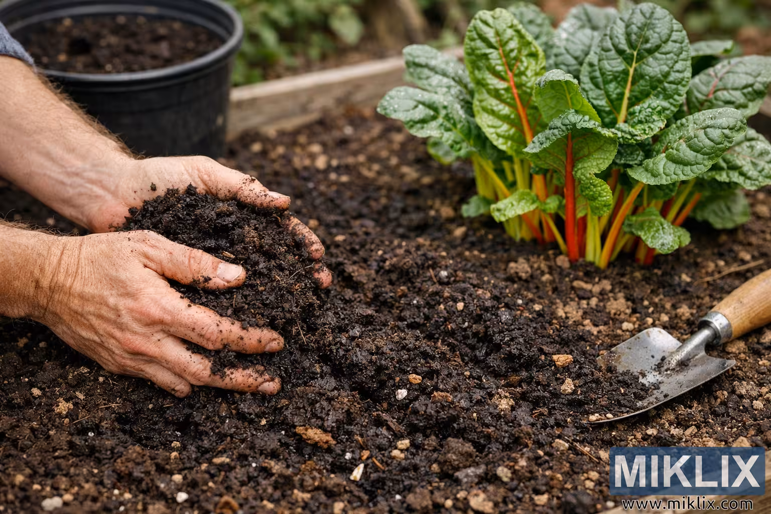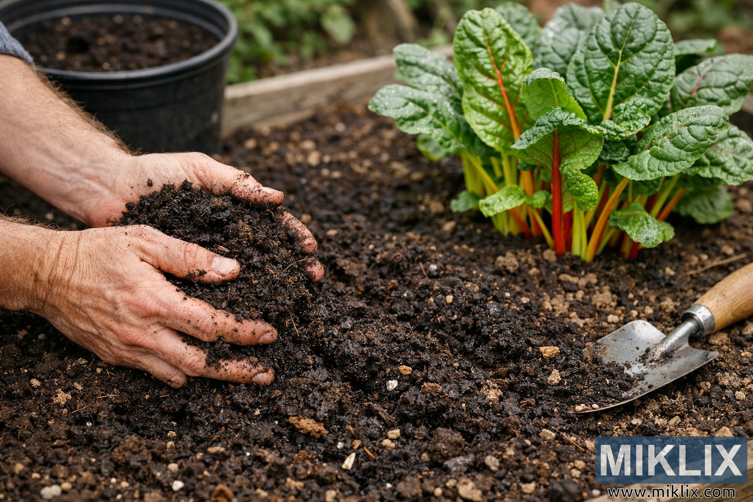 Close-up photograph of a gardener’s hands mixing compost into rich soil in a raised garden bed while preparing the area for growing Swiss chard.