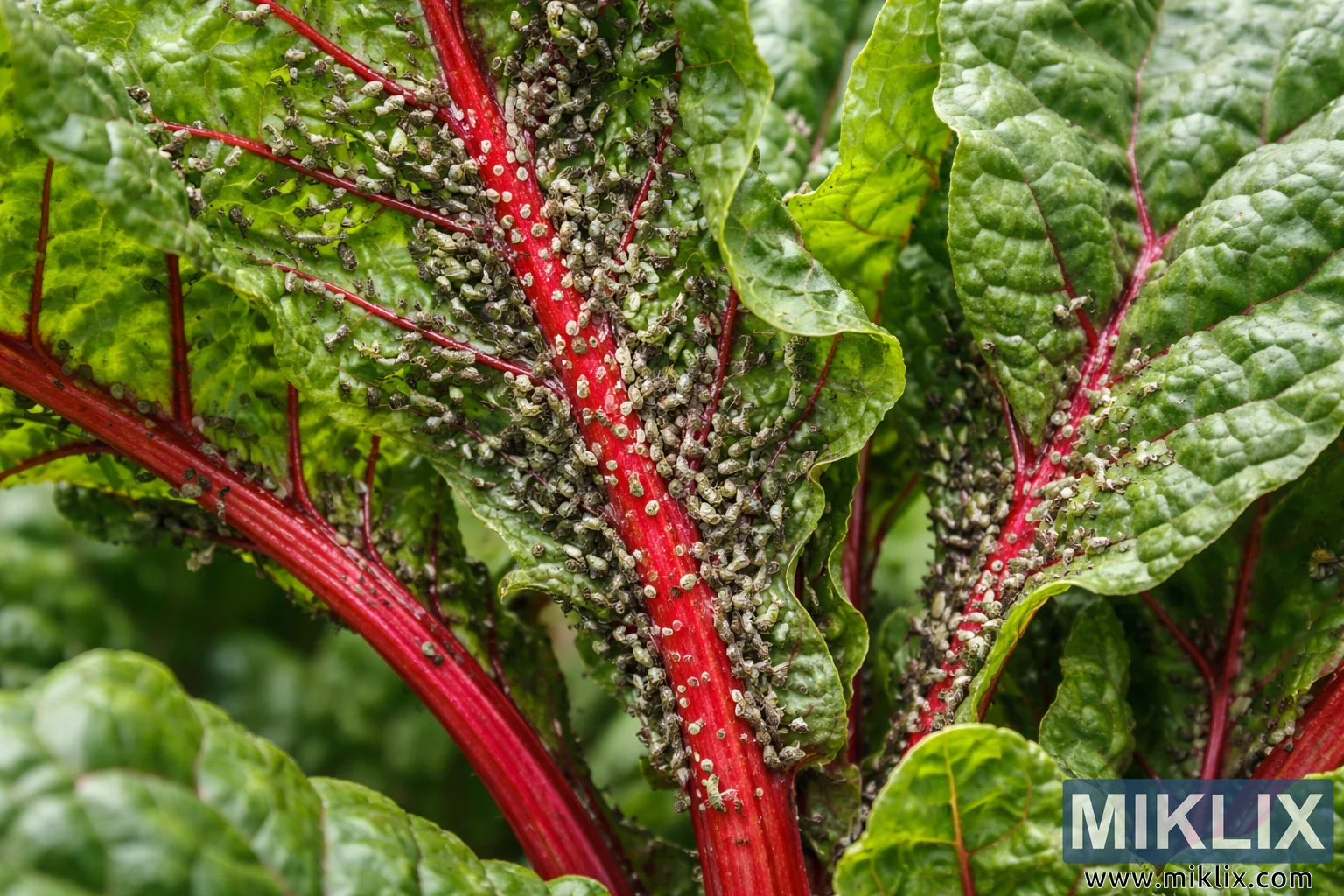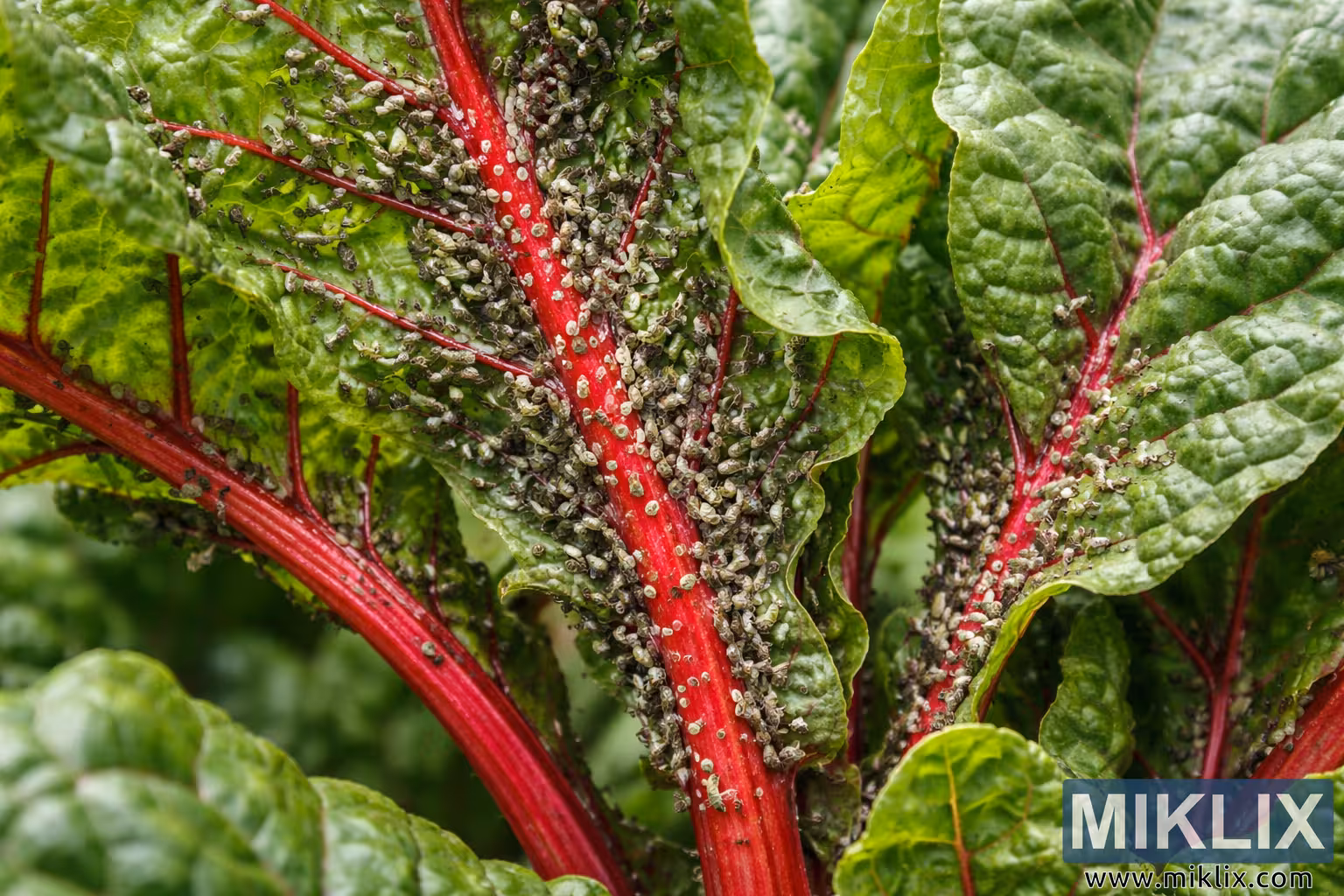 Detailed close-up image of Swiss chard under heavy aphid infestation, showing clusters of insects gathered along the red stems and green leaves.