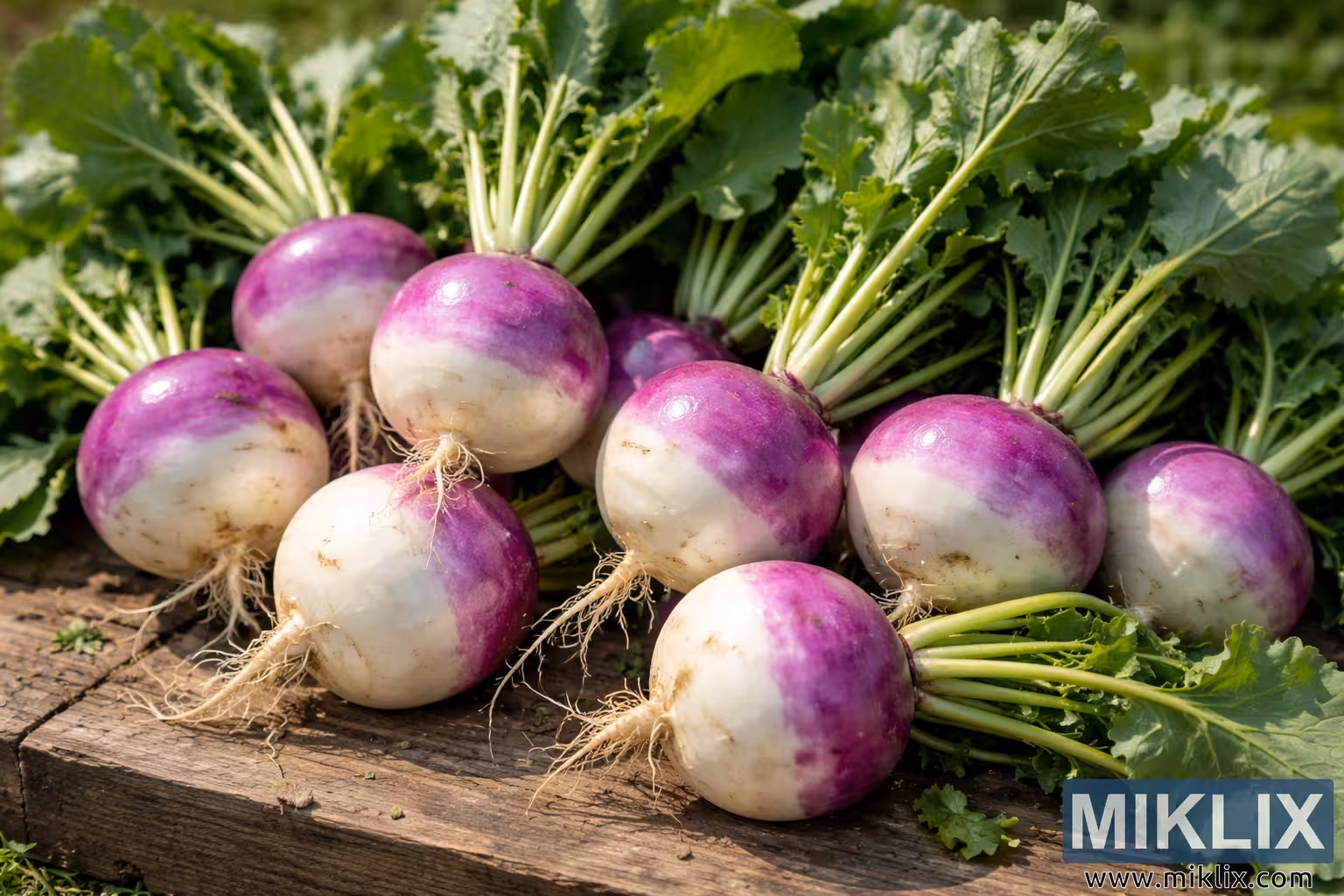 High-resolution image of freshly harvested purple top white globe turnips with vibrant green leaves arranged on a rustic wooden surface in natural outdoor light.