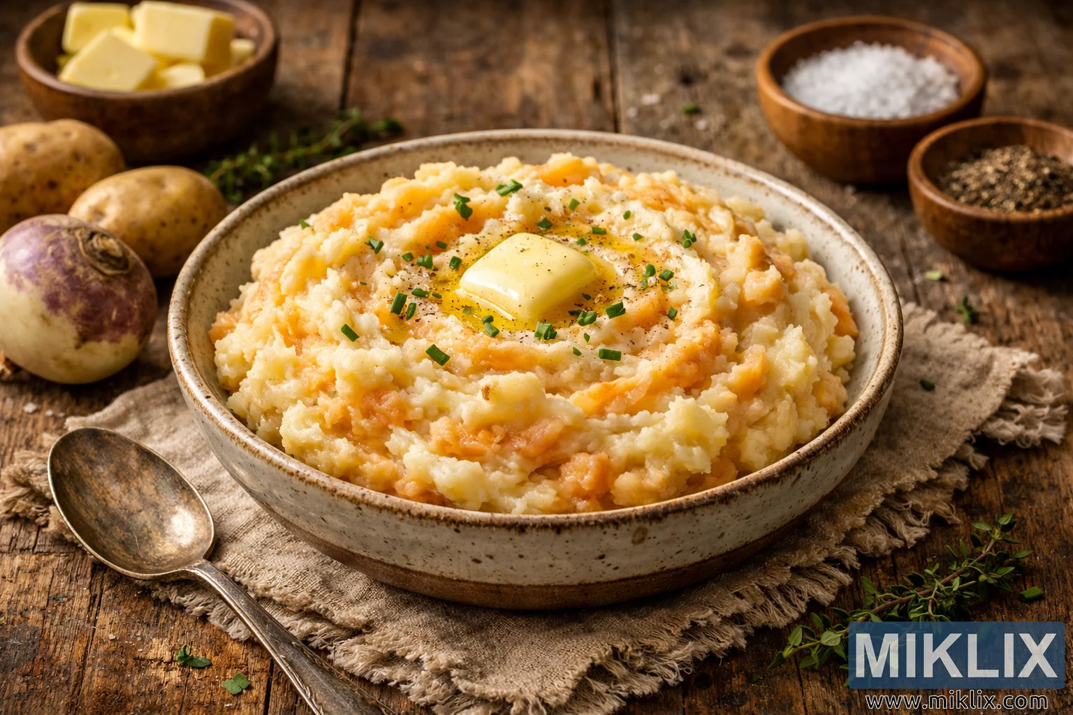 Beautifully presented turnip and potato mash served in a rustic bowl with butter, chives, and seasonings on a wooden farmhouse table.