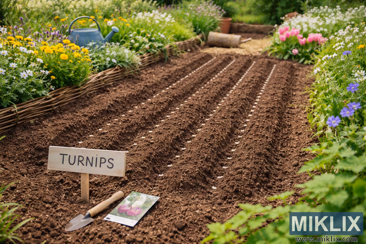 A freshly prepared spring garden bed with straight rows of soil and planted turnip seeds, bordered by blooming flowers and rustic gardening tools.