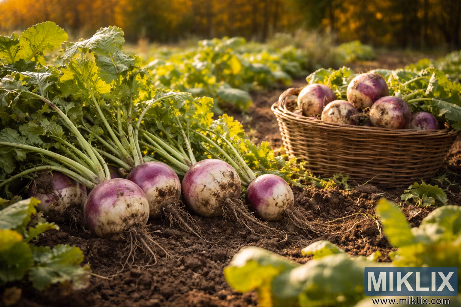 High-resolution photo of freshly harvested turnips in a late-season garden, with purple and white roots, green leaves, and a wicker basket in warm autumn sunlight.