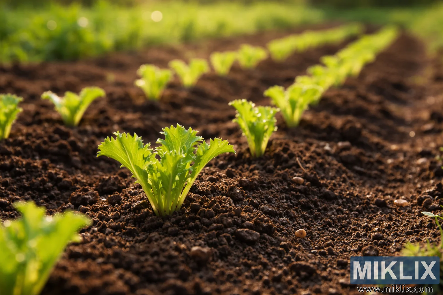 High-resolution landscape photo of young endive seedlings emerging from rich soil in a garden row, captured in warm early morning sunlight with shallow depth of field.