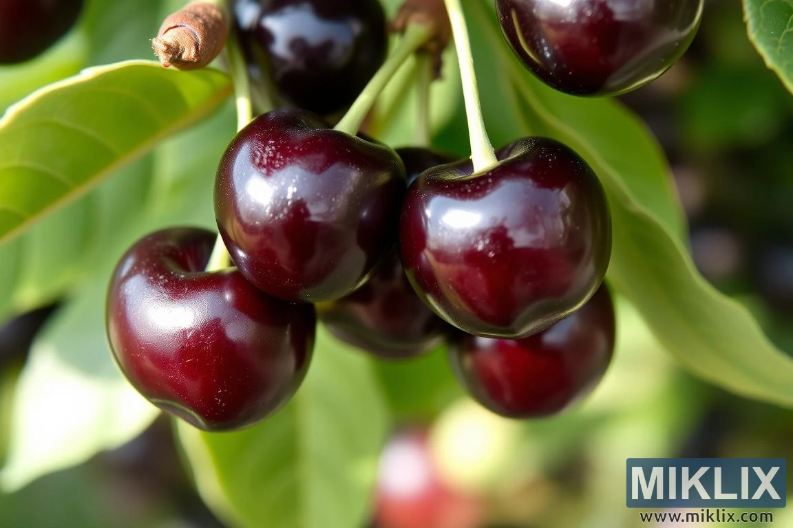 In this richly detailed close-up, a cluster of cherries hangs in quiet elegance from a tree branch, their deep, nearly black-red skins glistening with moisture and light. The cherries are plump and perfectly rounded, their taut surfaces gleaming with a natural gloss that speaks to peak ripeness and irresistible juiciness. Tiny droplets of water cling to their skins, catching the light like miniature jewels and adding a sense of immediacy—as if the fruit has just been kissed by morning dew or freshly rinsed by a gentle rain. The cherries’ coloration is intense and saturated, ranging from dark crimson to a velvety burgundy that borders on black, suggesting a depth of flavor that only comes with full maturity.