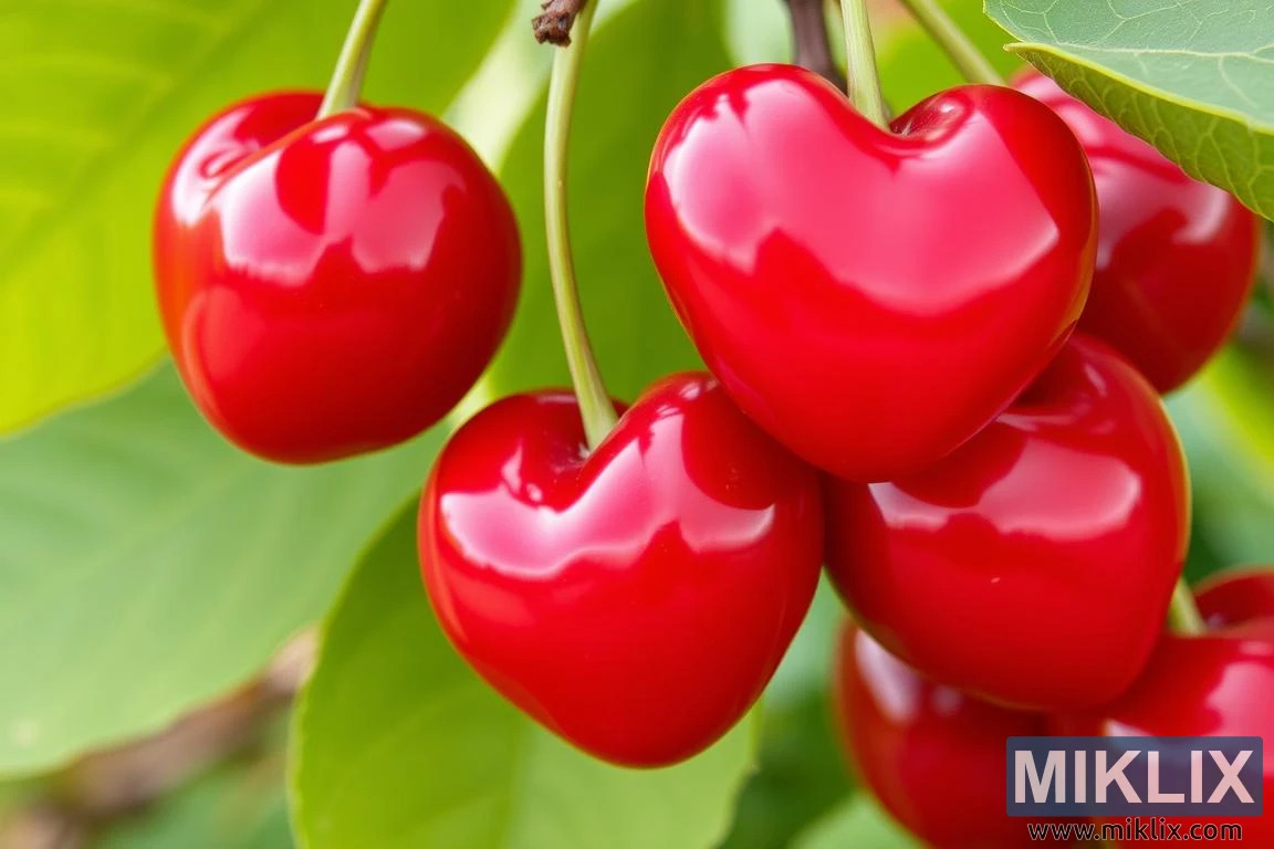 In this captivating close-up, a cluster of cherries hangs delicately from a tree branch, each fruit glowing with a rich, saturated red that evokes the warmth and abundance of midsummer. The cherries are plump and glossy, their smooth skins reflecting the soft natural light that filters through the surrounding foliage. This gentle illumination enhances their juiciness and freshness, making them appear almost dewy, as if kissed by the morning air. What sets these cherries apart is their charming, heart-like shape—a subtle but striking deviation from the typical round form. This unique contour adds a whimsical elegance to the scene, transforming the fruit into symbols of nature’s quiet artistry.