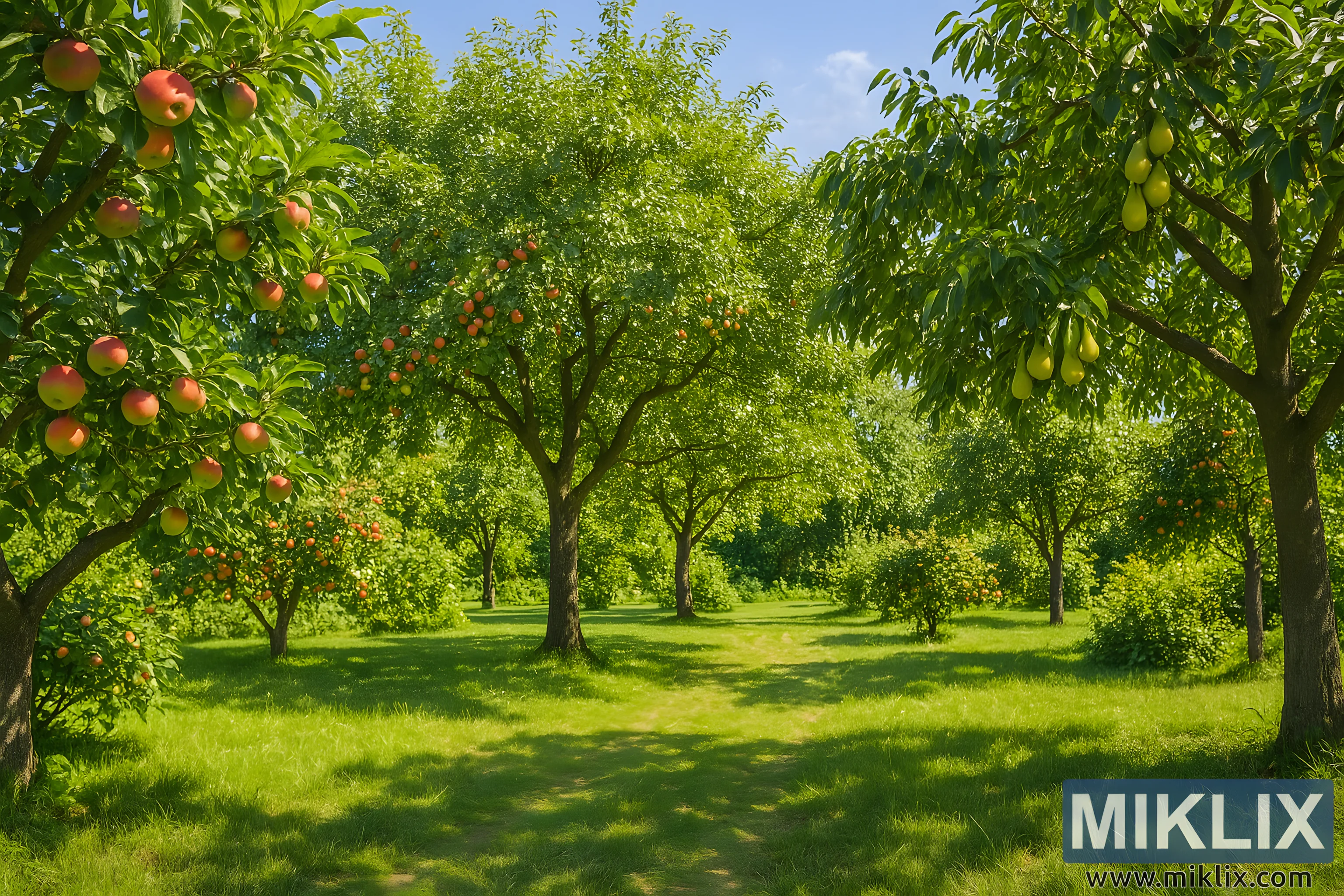 High-resolution image of a sunlit summer orchard featuring apple and pear trees, lush green grass, and dappled shade in a tranquil garden setting.