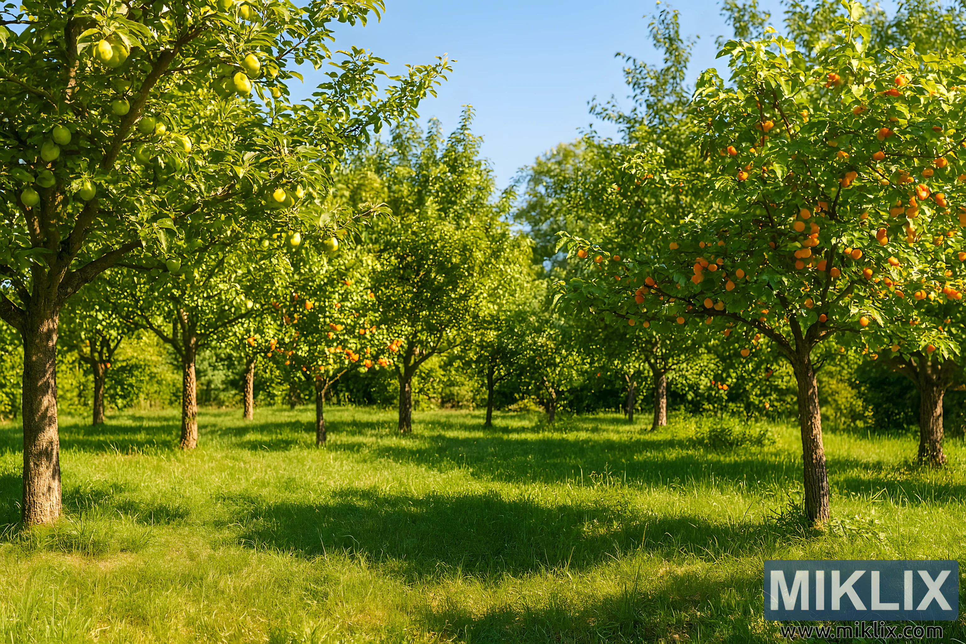 Explore a radiant summer orchard filled with fruit trees offering shade and a bountiful harvest under clear blue skies.