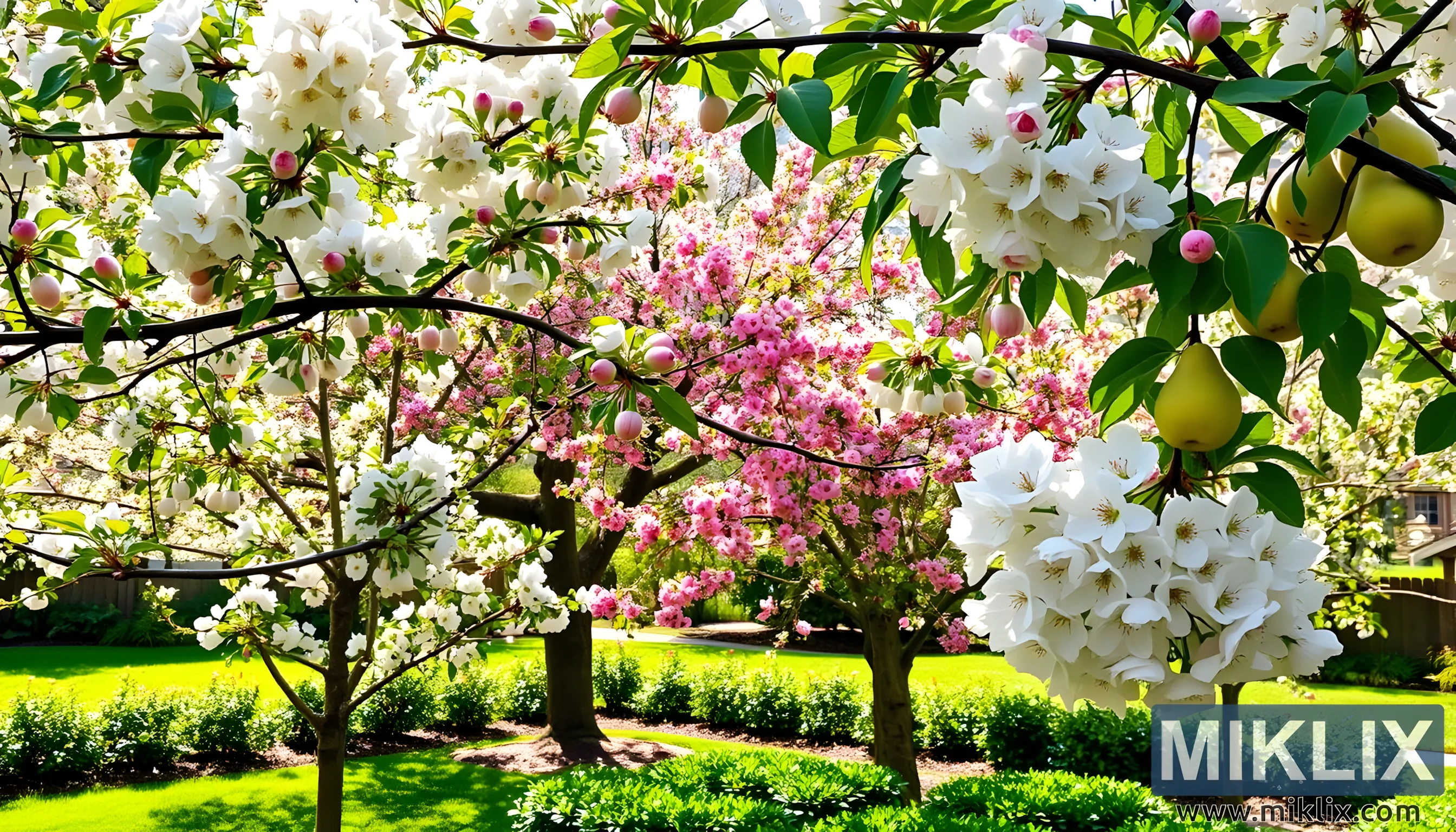 A lush orchard in full bloom with white and pink blossoms, golden pears, and vibrant greenery, bathed in warm spring sunlight.