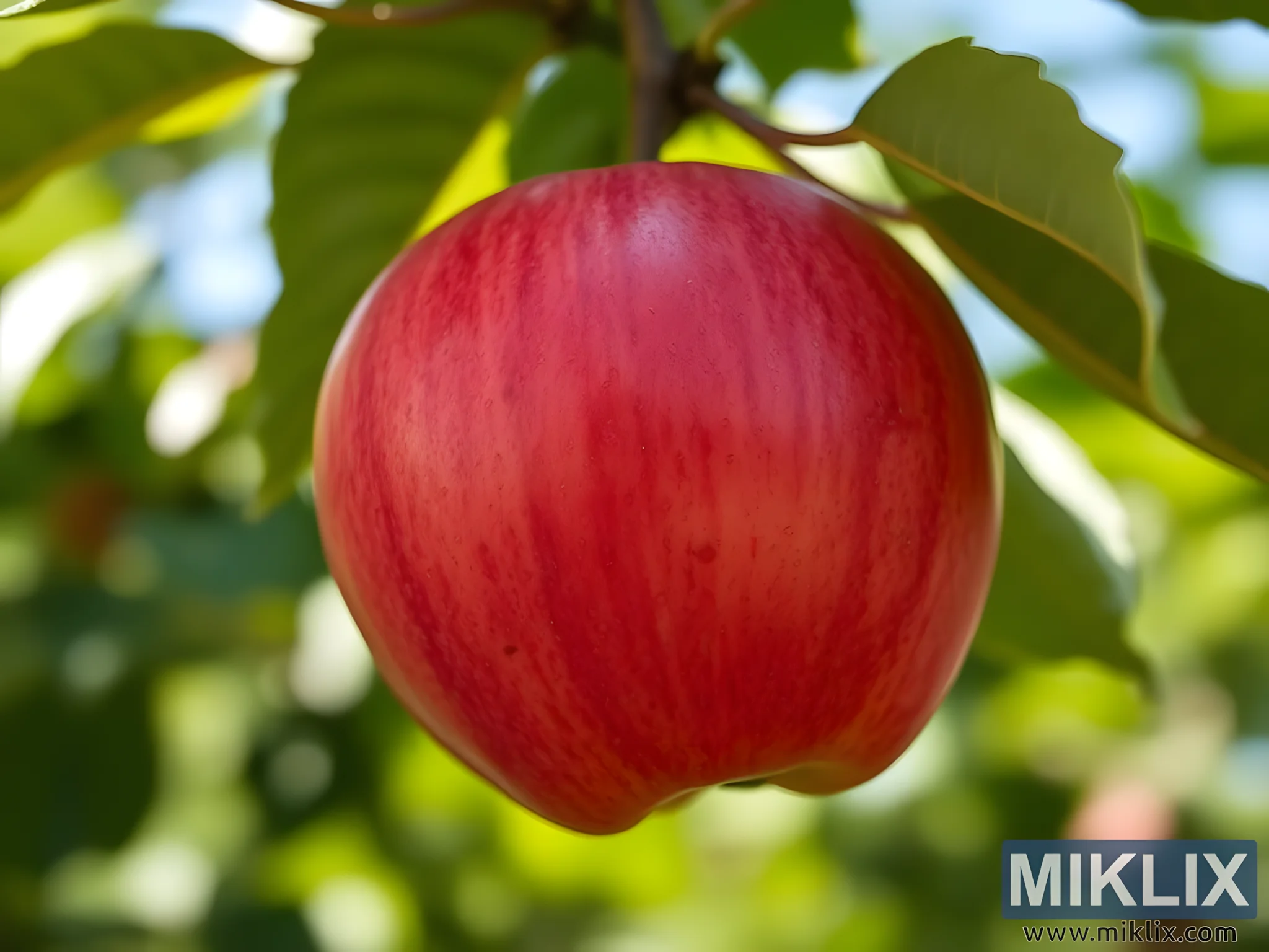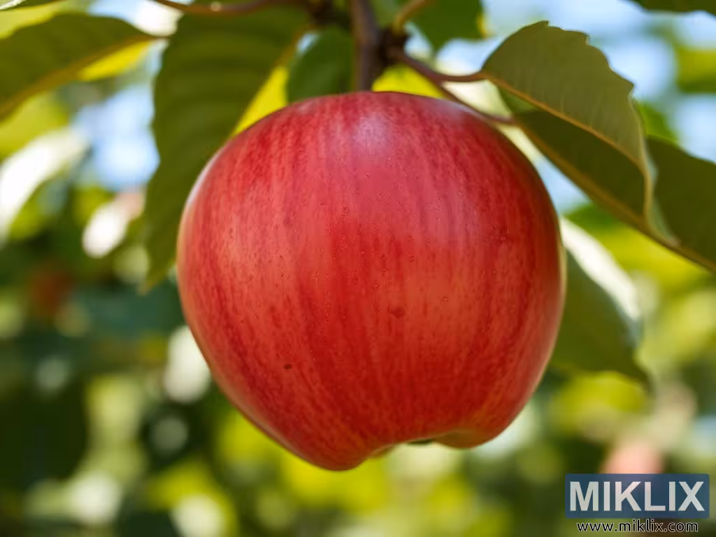 Close-up of a ripe red apple on a branch, surrounded by green leaves, bathed in sunlight in a serene orchard.