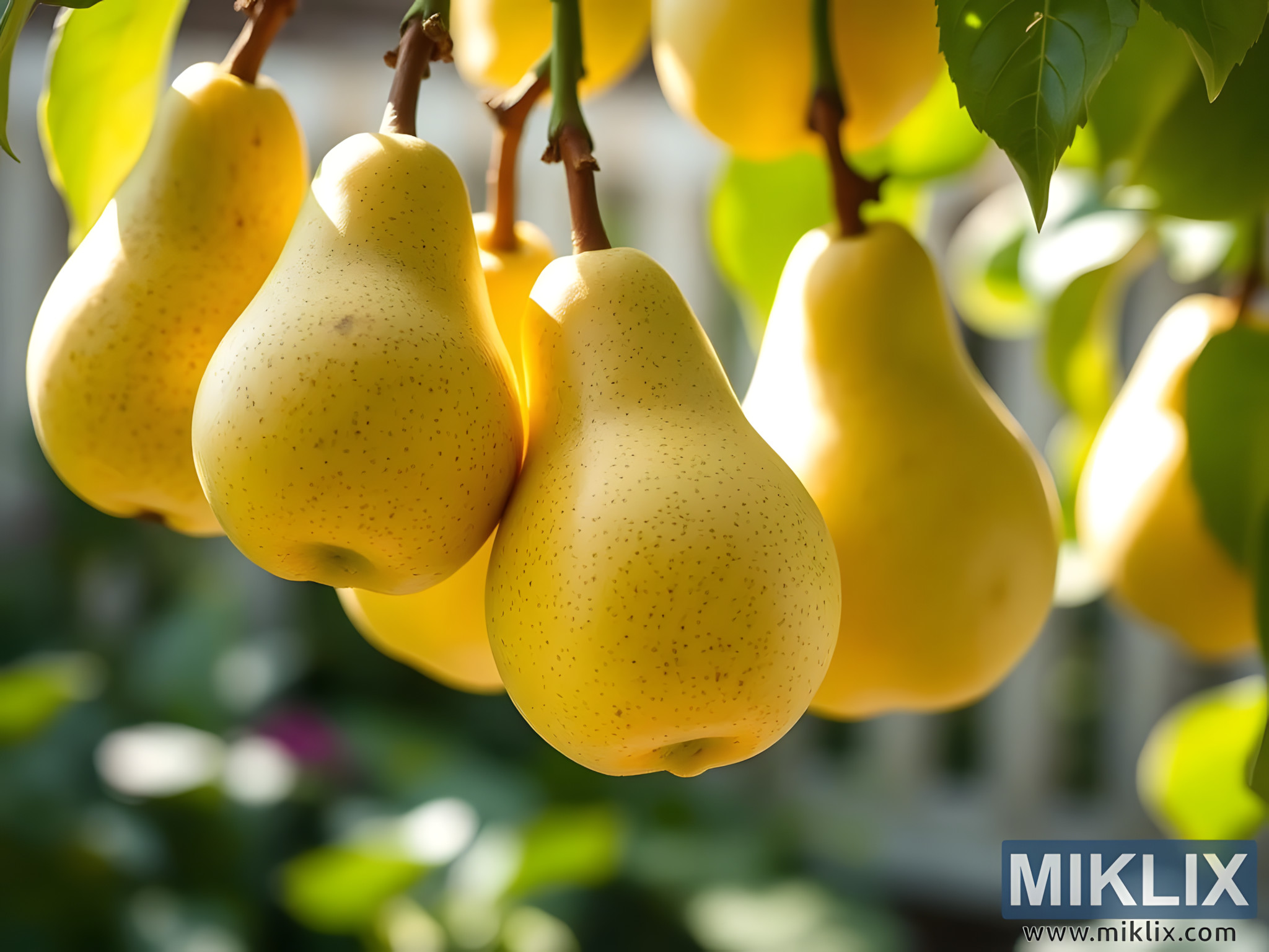 Close-up of ripe yellow pears on a tree branch, framed by green leaves, in a sunlit orchard scene.