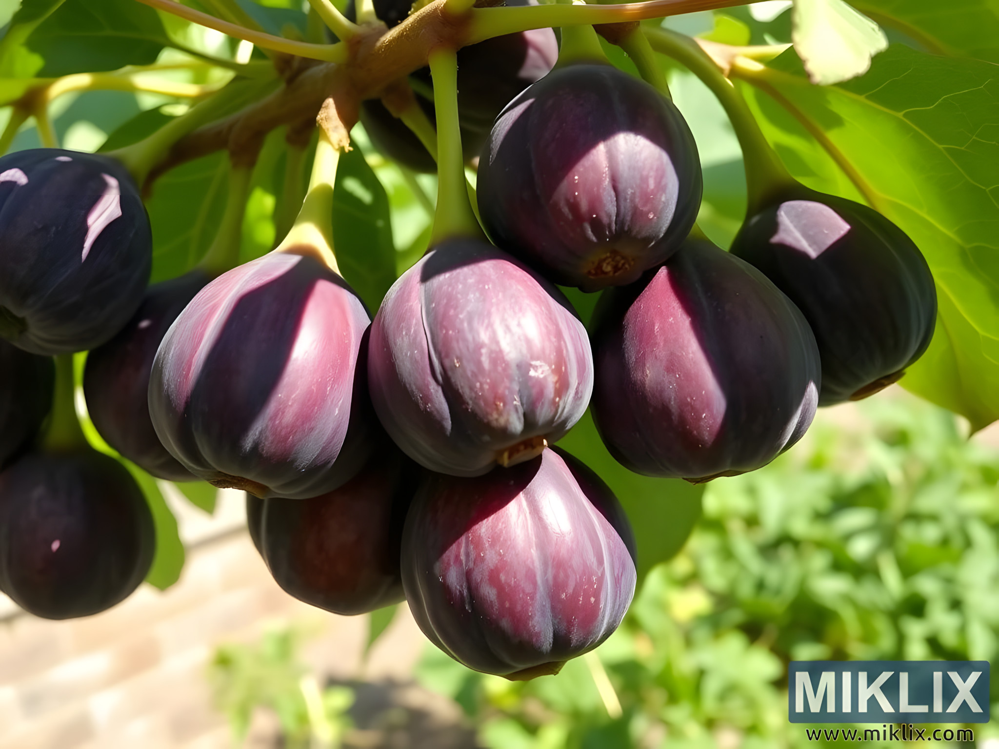 The figs hang in a generous cluster, their dark purple skins glowing softly under the touch of warm sunlight. Each fruit appears plump and heavy, as though brimming with sweetness and richness just beneath its smooth, slightly glossy surface. Subtle ridges run lengthwise across their rounded forms, catching glimmers of light that shift between shades of deep plum, muted violet, and almost black. These faint highlights and shadows give the figs a sculpted quality, accentuating their natural fullness and suggesting the ripeness that comes only at the peak of the season. They seem ready to yield to the gentlest touch, promising the honeyed flesh and delicate fragrance within.