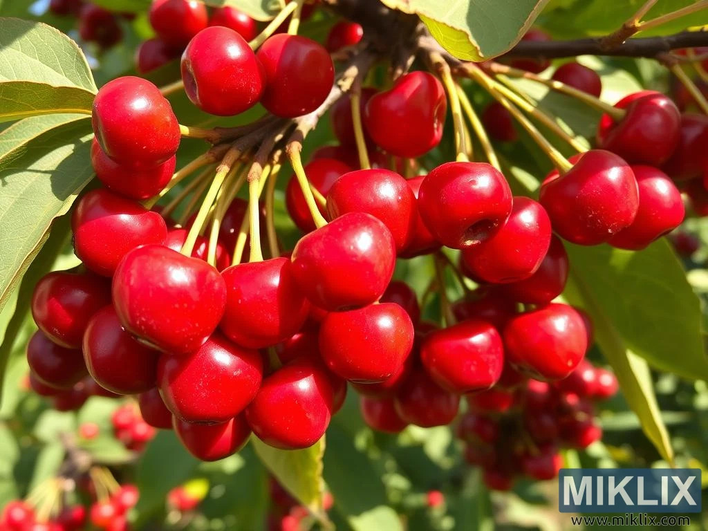 Close-up of ripe, glossy red cherries on a tree branch with green leaves, highlighting freshness and peak harvest season.