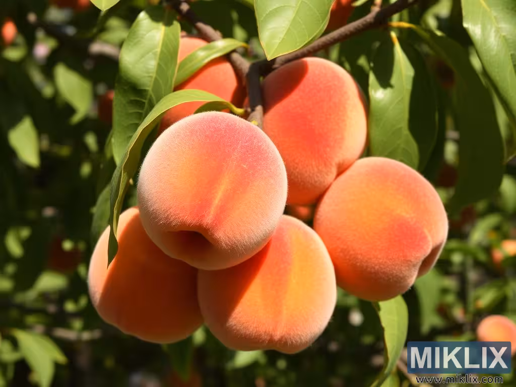 Close-up of ripe, juicy peaches on a tree branch with green leaves, glowing in sunlight, showcasing summer orchard abundance.